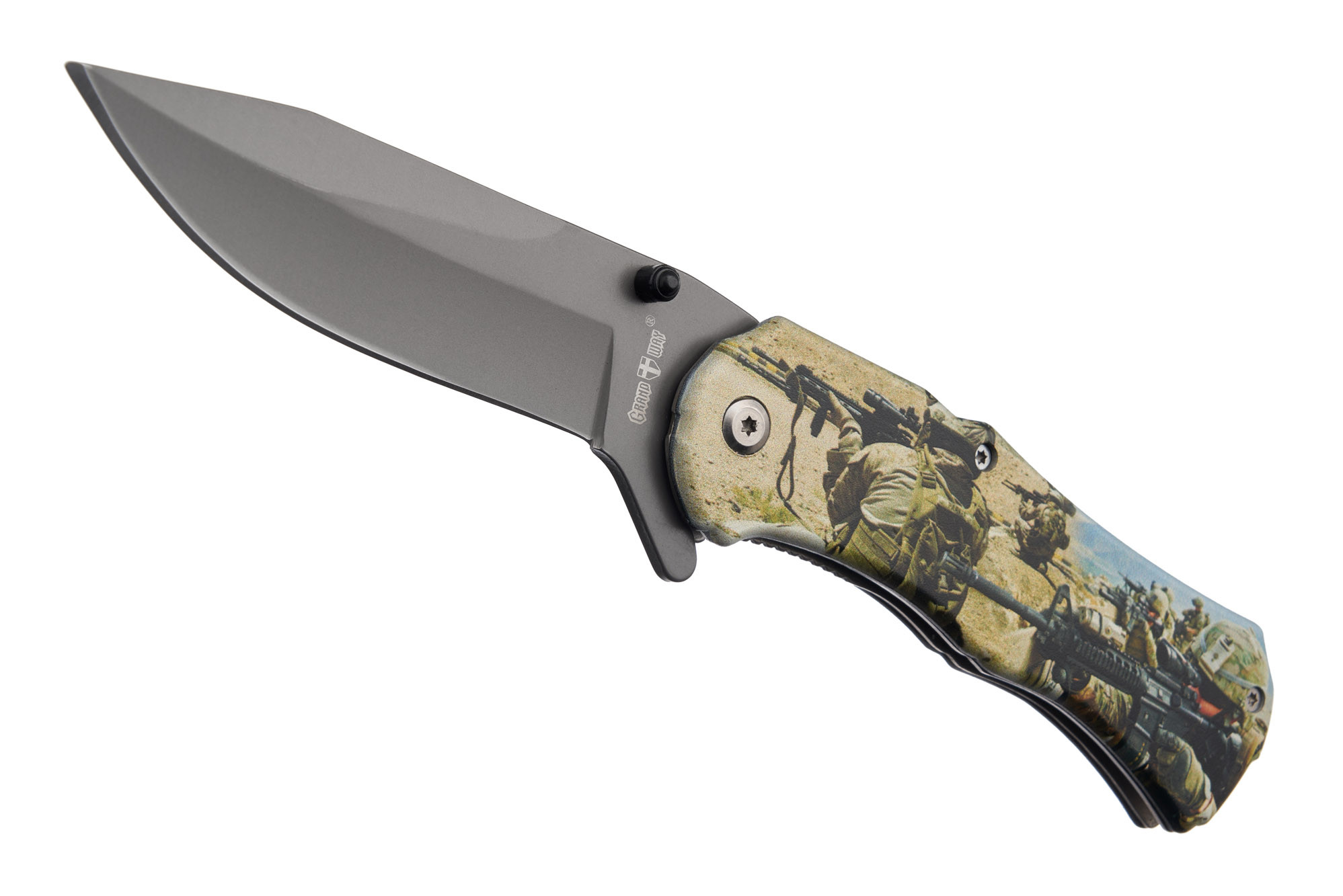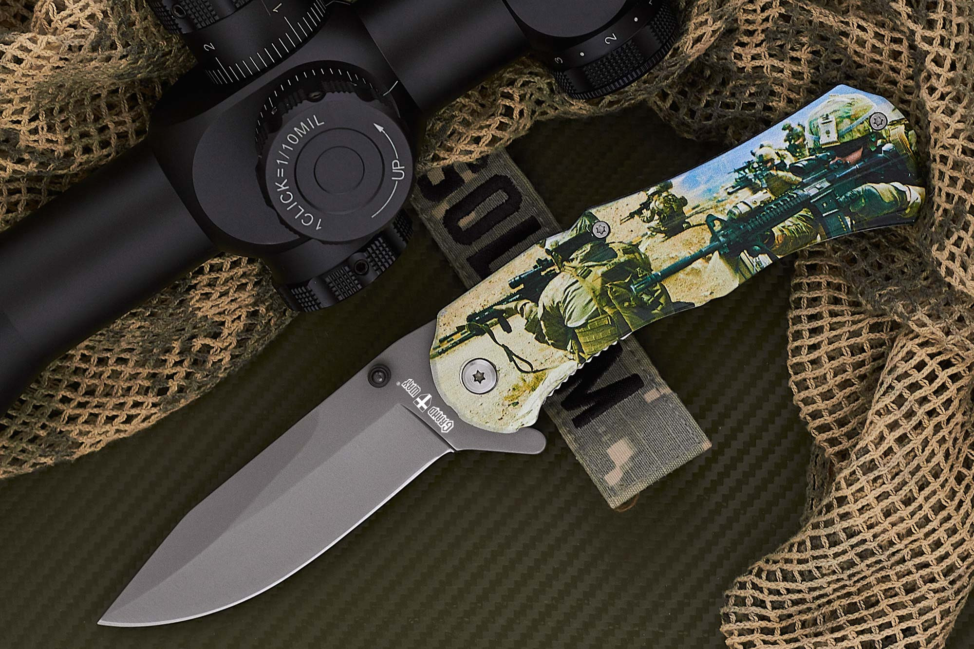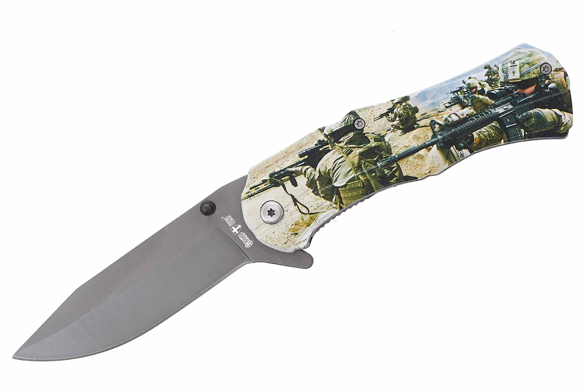 Плашки рукояти украшены рисунком в стиле милитари. Довольно чётким и качественным. На правой стороне в районе осевого механизма расположена в меру тугая, аккуратная «tip-up» клипса.