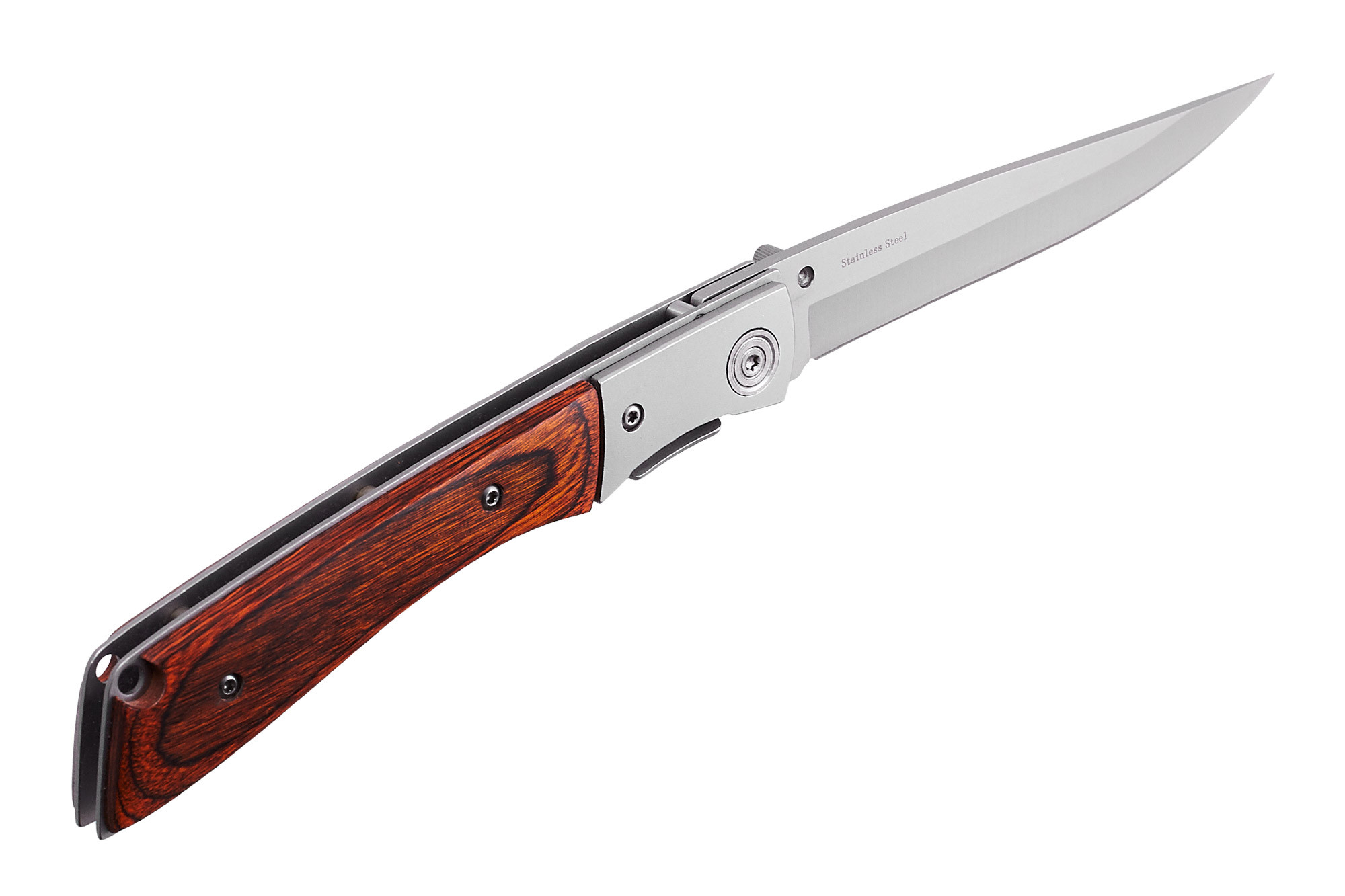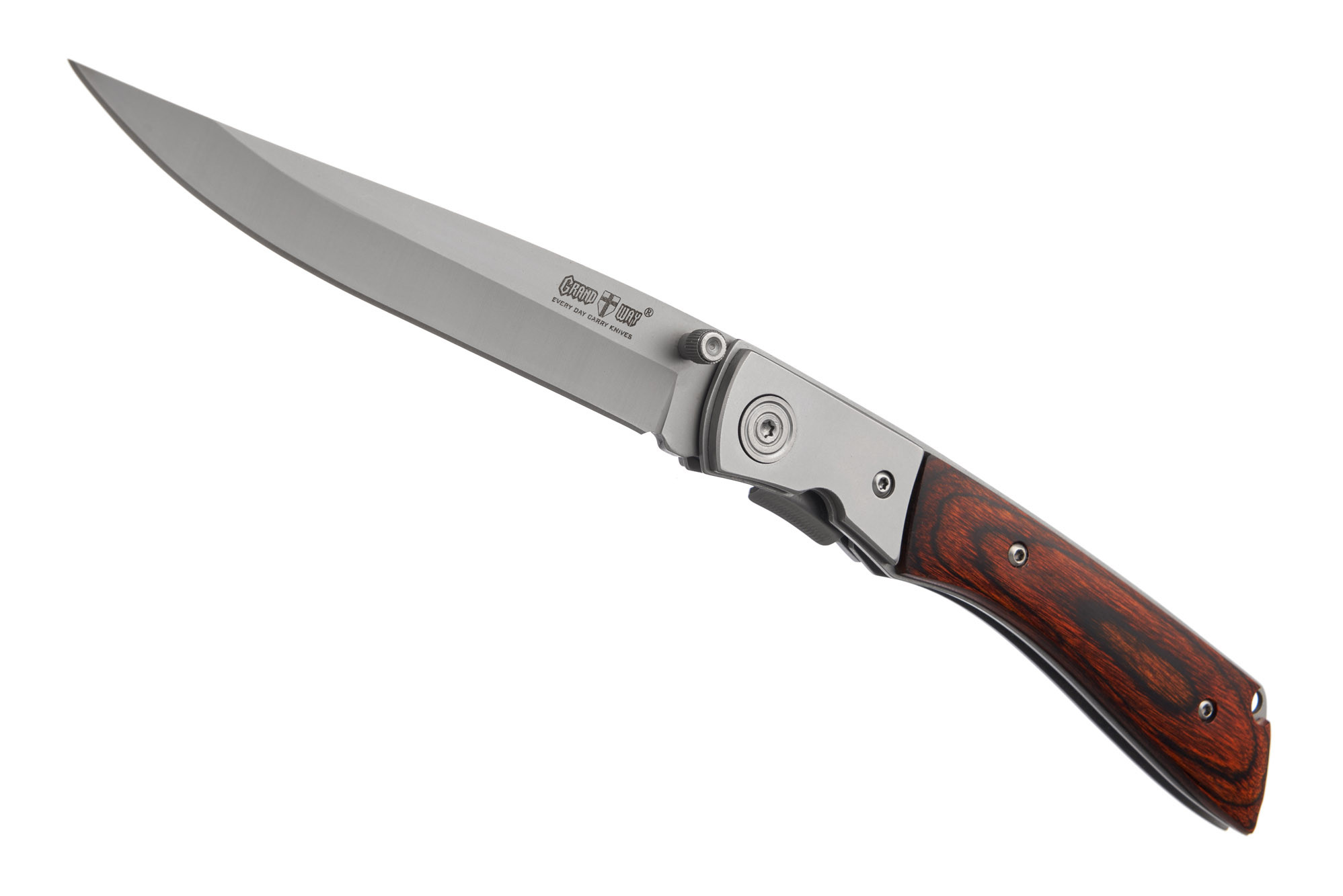 Не нравятся маленькие перочинные ножики, которыми сложно отрезать кусок хлеба, но и не нравятся крупные массивные ножи? С этой моделью таких проблем не будет. Нож большой и одновременно легкий и элегантный. Длинный клинок, аккуратная рукоять простой, но продуманной формы с деревянными накладками прекрасно лежит в руке. Древесина прошла специальную обработку и не боится влаги. Сама рукоять изготовлена из толстых стальных пластин и скреплена прочными винтами.Для дополнительной прочности, у регулируемого осевого винта, имеются металлические больстеры.