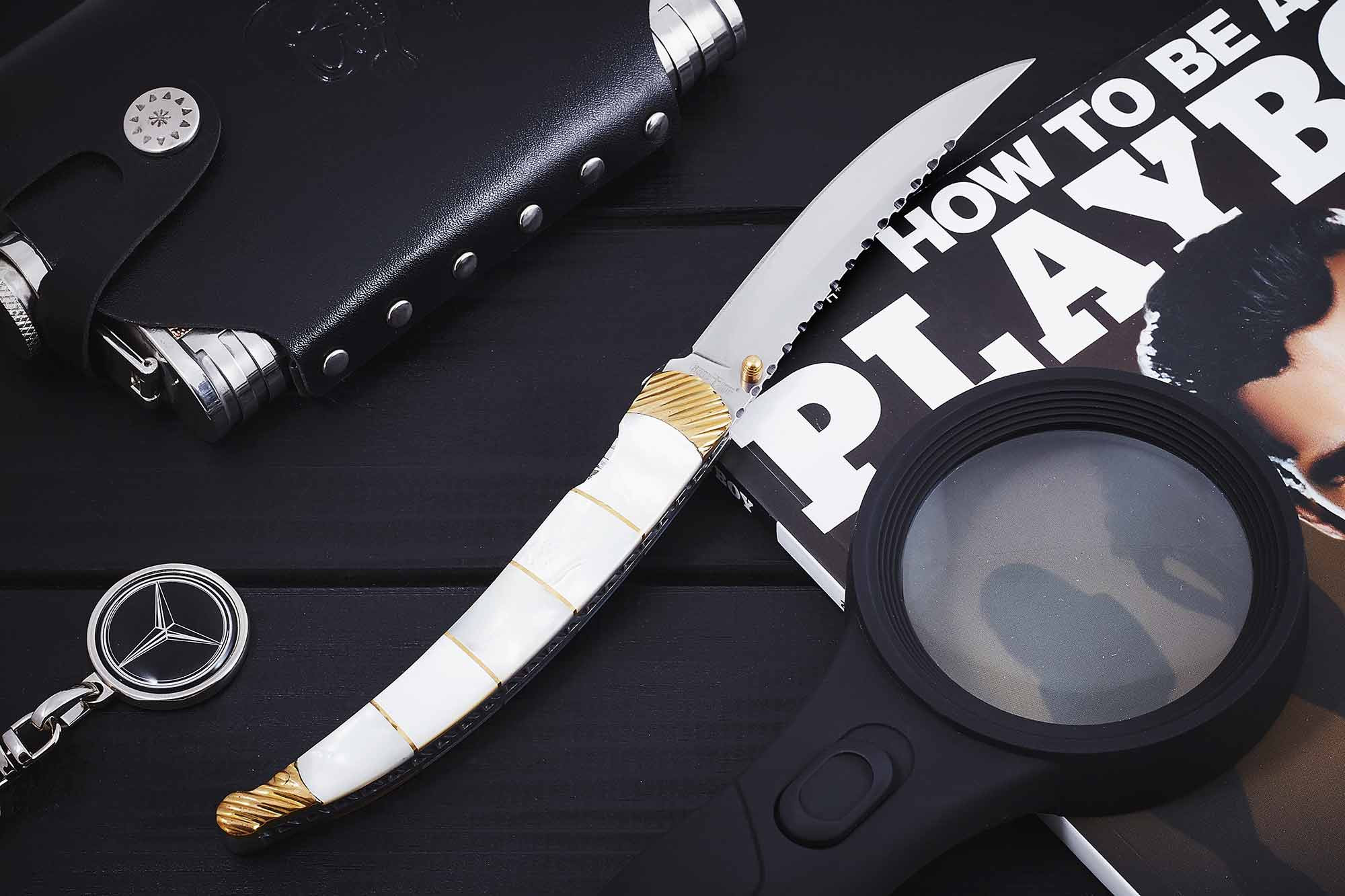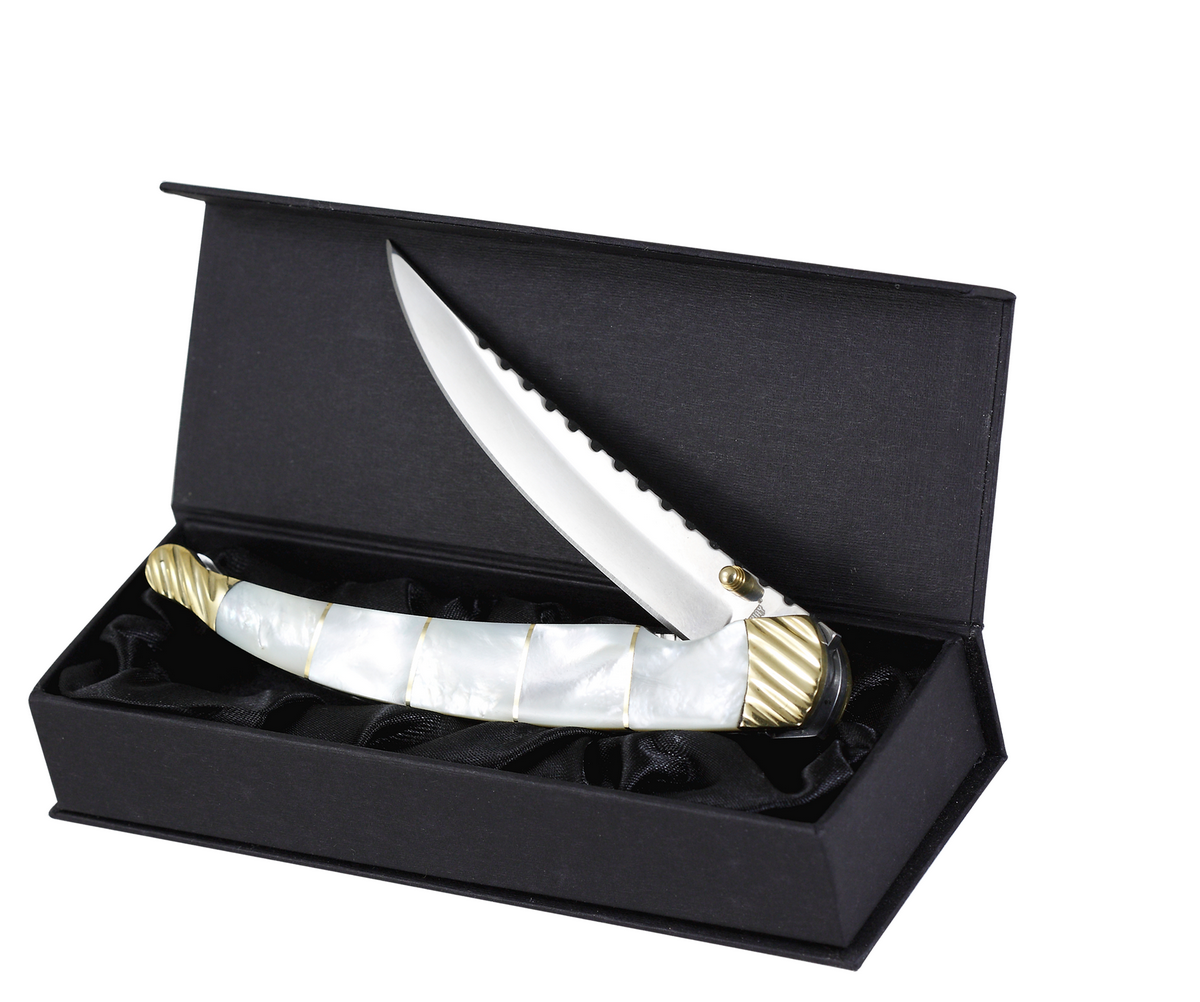 За современные материалы в этом ноже отвечает технологичная сталь 440 С из которой изготовлен ее зеркально полированный клинок. Другая довольно важная деталь: рукоять ножа 8013 SWS изготавливается с использованием натуральных материалов – натурального перламутра и дополнительно украшена и усилена латунью.