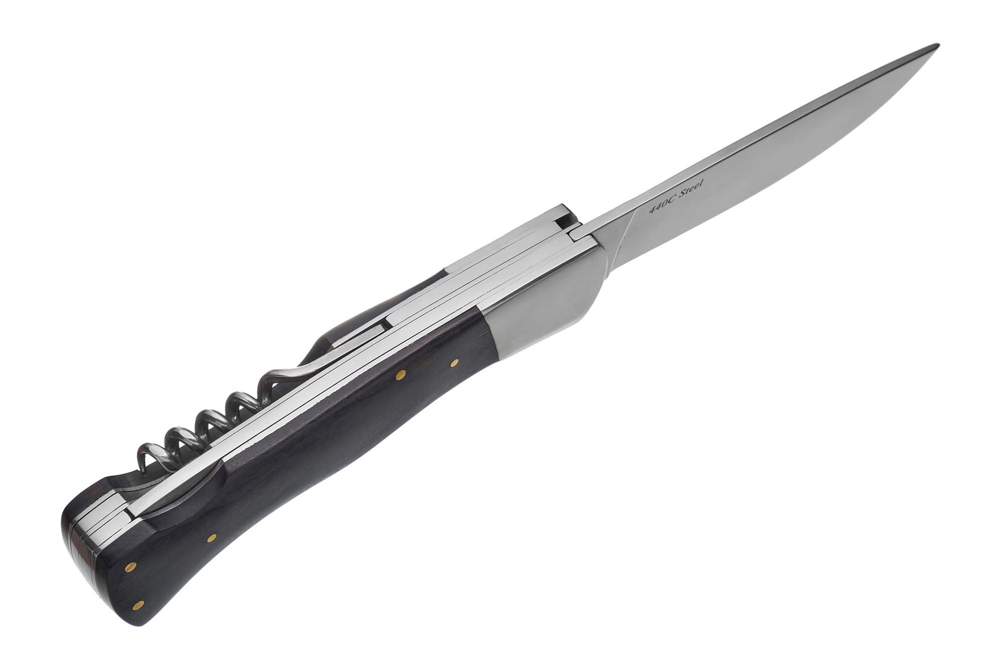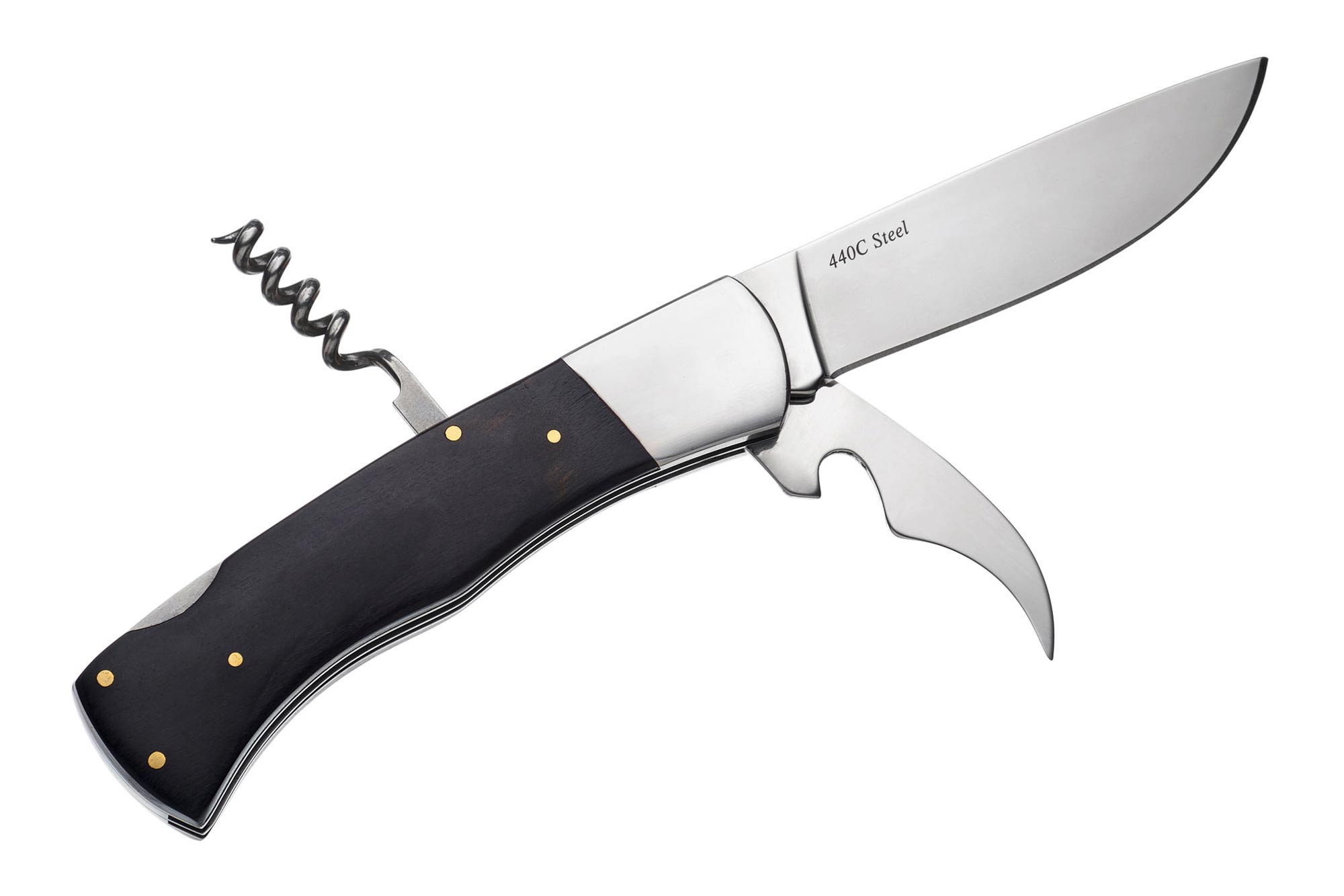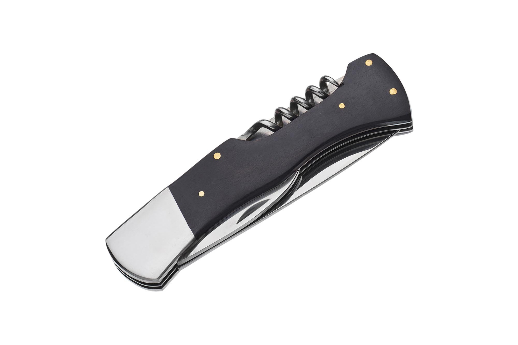 Помимо своей основной функции, нож может выполнять функции консервного ножа и штопора. Рукоять ножа выполнена с применением деревянных и стальных накладок. Древесина прошла специальную обработку, устойчива к влаге, гниению и вредителям. Темный палисандр великолепно сочетается с холодным блеском полированного клинка. Помимо этого, красивая деревянная рукоять несет и чисто функциональную нагрузку - зимой такая рукоять не холодит руки.