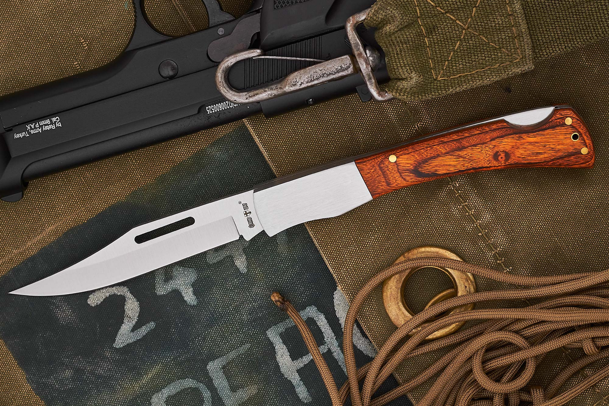 По конструкции – это абсолютная классика в простом исполнени. Никаких непрактичных решений и лишних элементов. Только проверенные временем материалы: нержавеющая и легко затачиваемая 420 сталь, металлическая рукоять с деревяяными накладками, простая конструкция и замок бэк-лок.