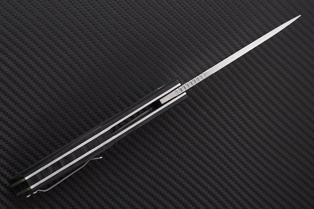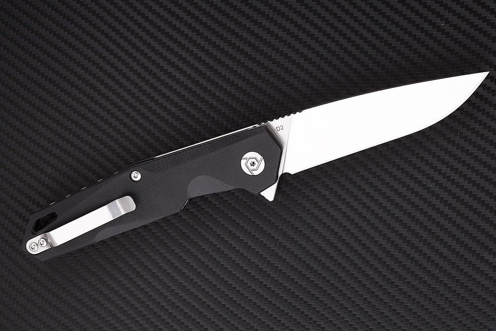 Клинок имеет форму drop point, длину 90 мм, толщину 3,8 мм. Спуски прямые от самого обуха, маленькие, аккуратно выполненные подводы, тонкое сведение (примерно 0,4 мм). Учитывая, что сталь D2 хорошо известна отличными режущими свойствами изготовленных из неё клинков, можно с уверенностью утверждать, что модель 1047 просто создана, для того чтобы резать. Резать легко. Резать долго.