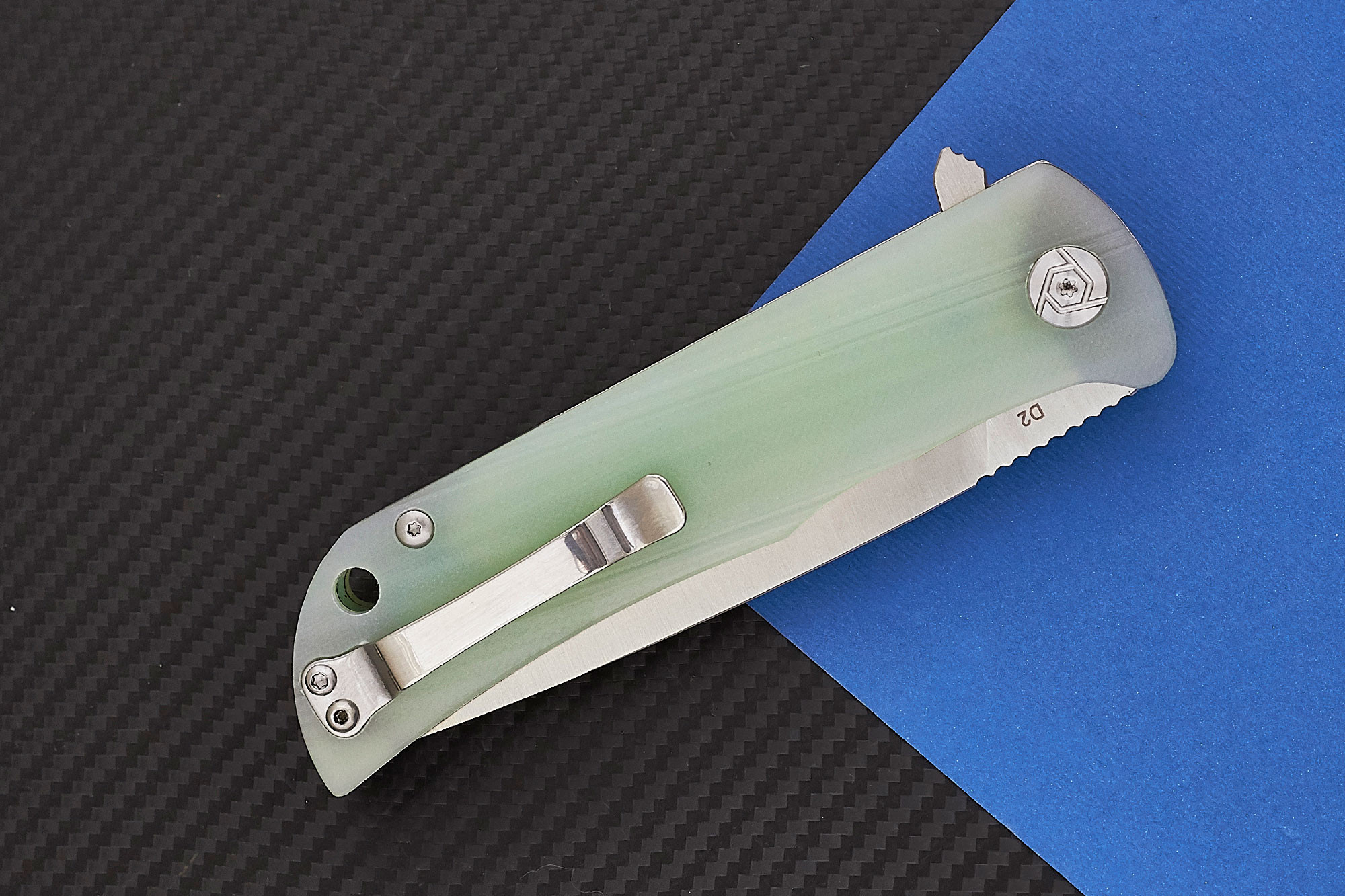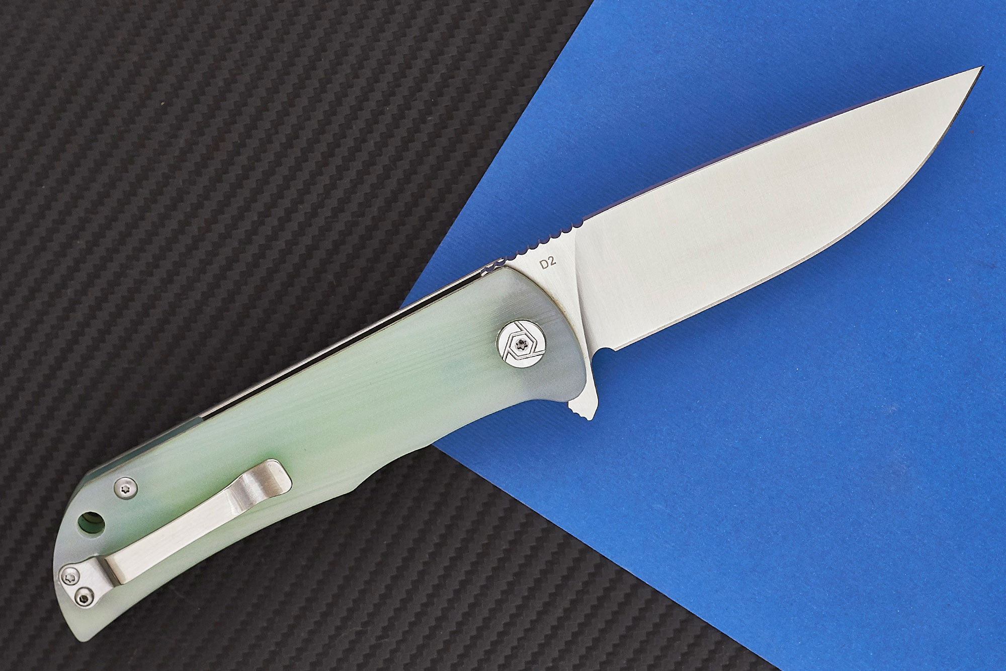 Данная модель выполнена в ставшем многим уже привычным формфакторе складного EDC ножа-флиппера с замком типа liner lock. Вес ножа - 143 г, длина в сложенном состоянии - 120 мм, на правой плашке рукояти находится стальная клипса. Нож легко садится на карман, не занимает много места, не является обузой. При этом его клинок имеет длину в 96 мм и толщину по обуху в 4 мм, что является серьёзной заявкой на исключительную прочность и работоспособность. Гринд клинка, казалось бы, незамысловат, но, на самом деле, практичен и функционален. Спуски прямые от самого обуха, аккуратные небольшие подводы, тонкое сведение (около 0,4 мм) – перед нами отменный резак, особенно если учитывать, что изготовлен он из D2.