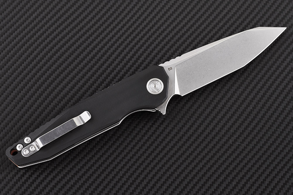 Рукоять ножа состоит из пары массивных, необлегчённых стальных лайнеров покрытых шероховатыми накладками из прочного композита G10. Все детали рукояти тщательно обработаны и подогнаны, сняты фаски, ничего не впивается и не режет ладонь, люфтов и перекосов нет. Угловатая и массивная, на первый взгляд, рукоять удобно заполняет ладонь и комфортна при разных хватах. Такие необходимые элементы как темлячное отверстие и клипса тоже присутствуют на положенных им местах.