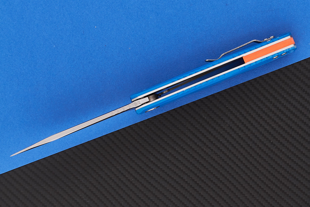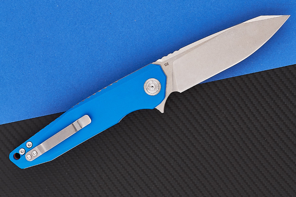 Сам клинок имеет оригинальный сложный гринд и несколько тантообразные очертания. Длина клинка 96 мм, толщина по обуху 4 мм. Спуски высокие, почти от обуха, прямые. Подводы маленькие, аккуратные симметричные. Сведение примерно 0,5 мм. На обухе находится крупная насечка под палец, а режущая кромка завершается чойлом, значительно облегчающим её заточку.
