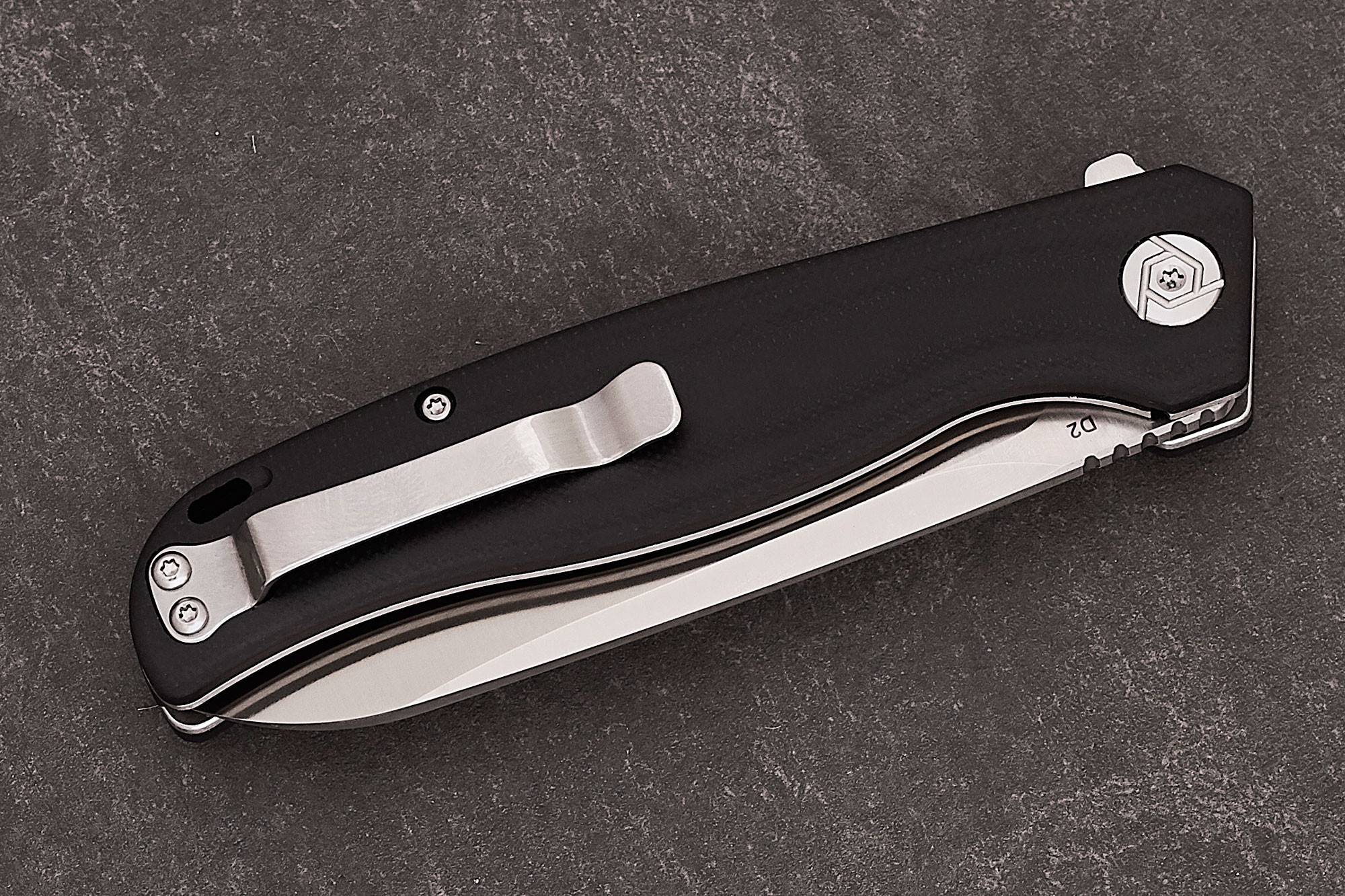 Рукоять ножа с одной стороны стандартна - пара стальных лайнеров, покрытых эргономичными накладками из прочного стойкого композита G10. С другой стороны, обращает внимание оригинальный "сквозной" дизайн облегчений левой накладки. Это не первый подобный "сквозной" нож, от китайских производителей, но любителям оригинальных решений он должен вполне понравиться.