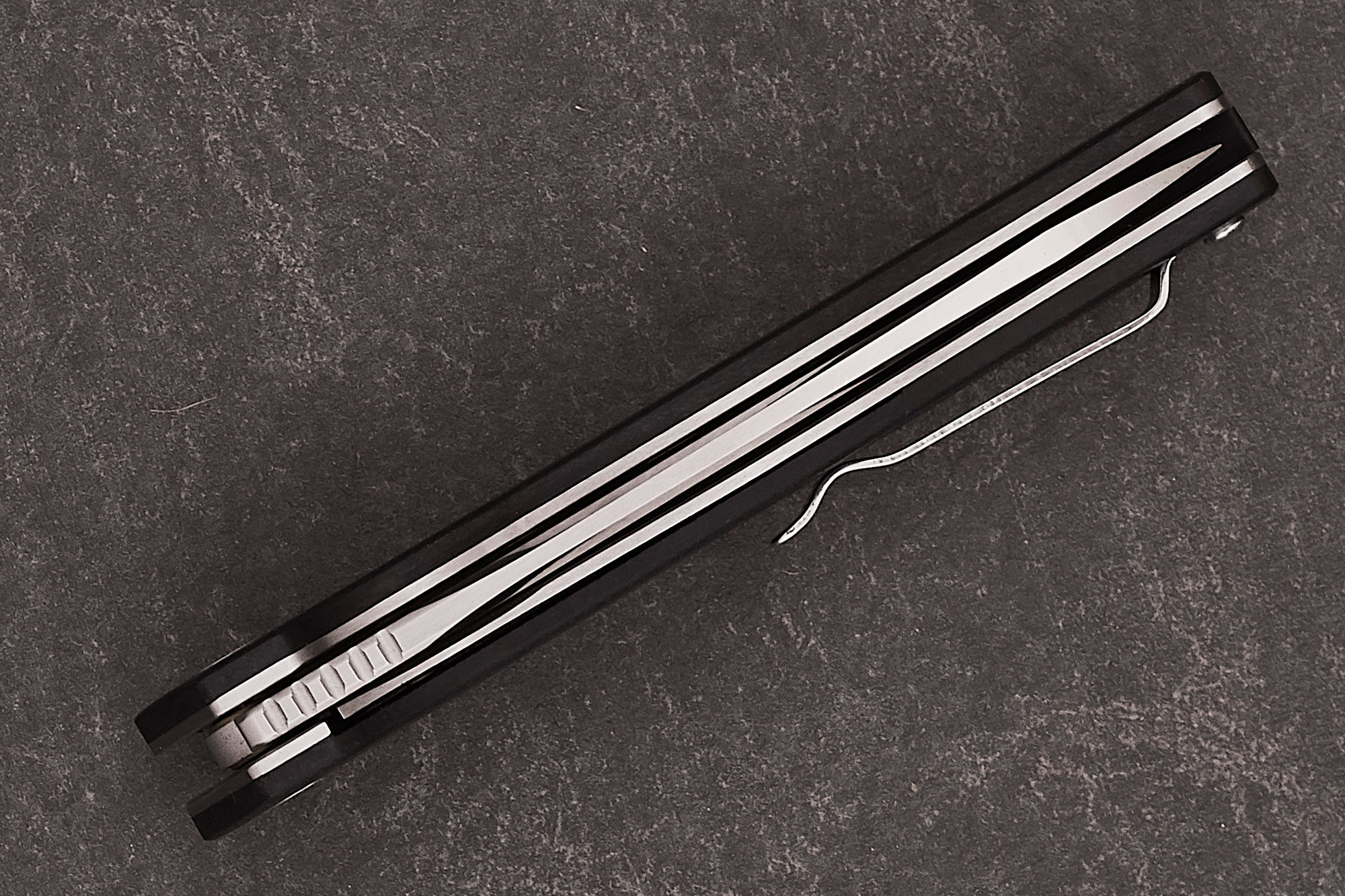 Естественно, на рукояти предусмотрены просто обязательные в наше время стальная клипса и небольшое аккуратное темлячное отверстие.