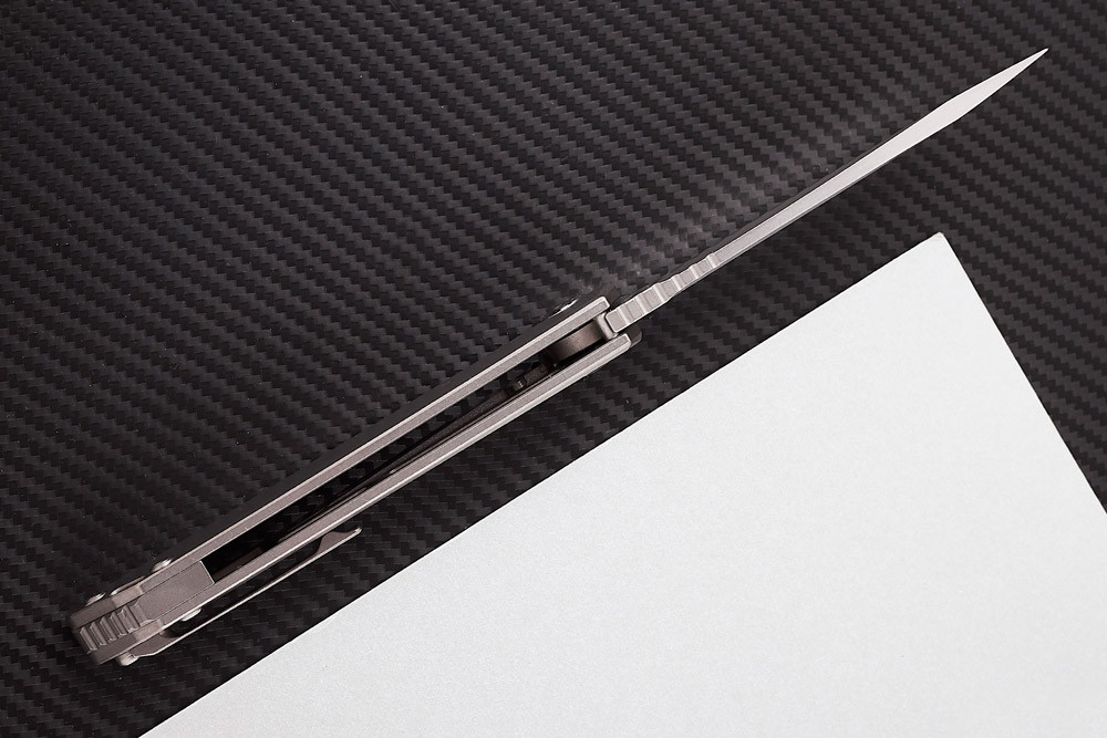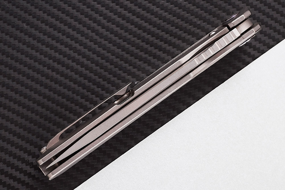 Осевой механизм содержит подшипники, его работа безупречна. Титановая пружина надёжного замка типа frame lock дополнительно усилена стальным сухарём, значительно повышающим её долговечность.