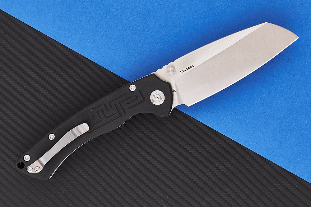 Рукоять с накладками из G10 достаточно велика и удобна. В лайнерах – облегчающие выштамповки. На накладках – геометрический узор, имитирующий орнаменты южноамериканских индейцев. Это – явная стилистическая отсылка к родине птицы тукана, чьим именем назван этот нож.