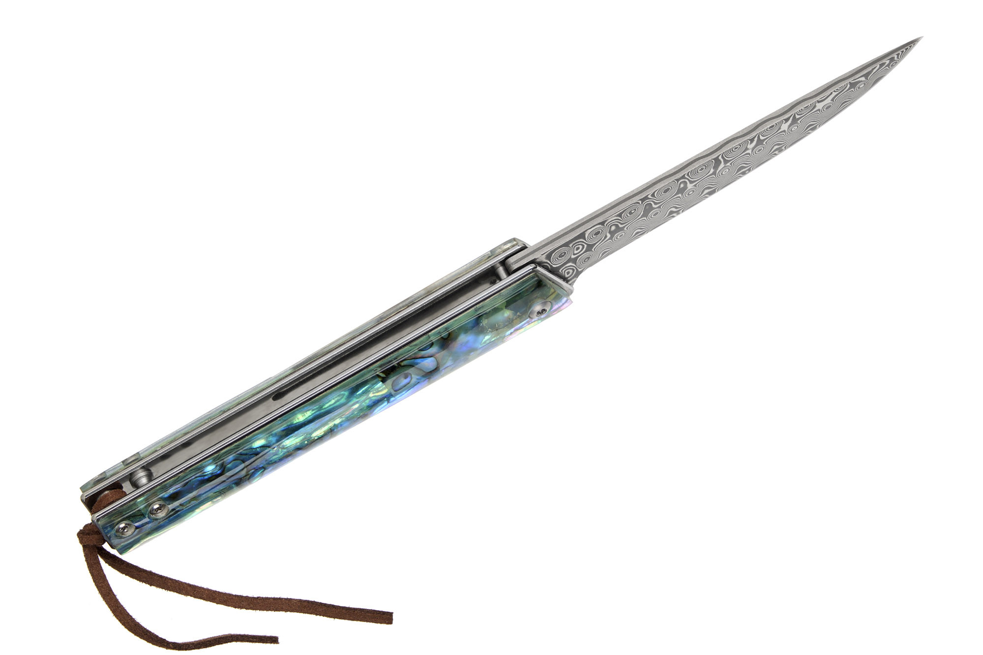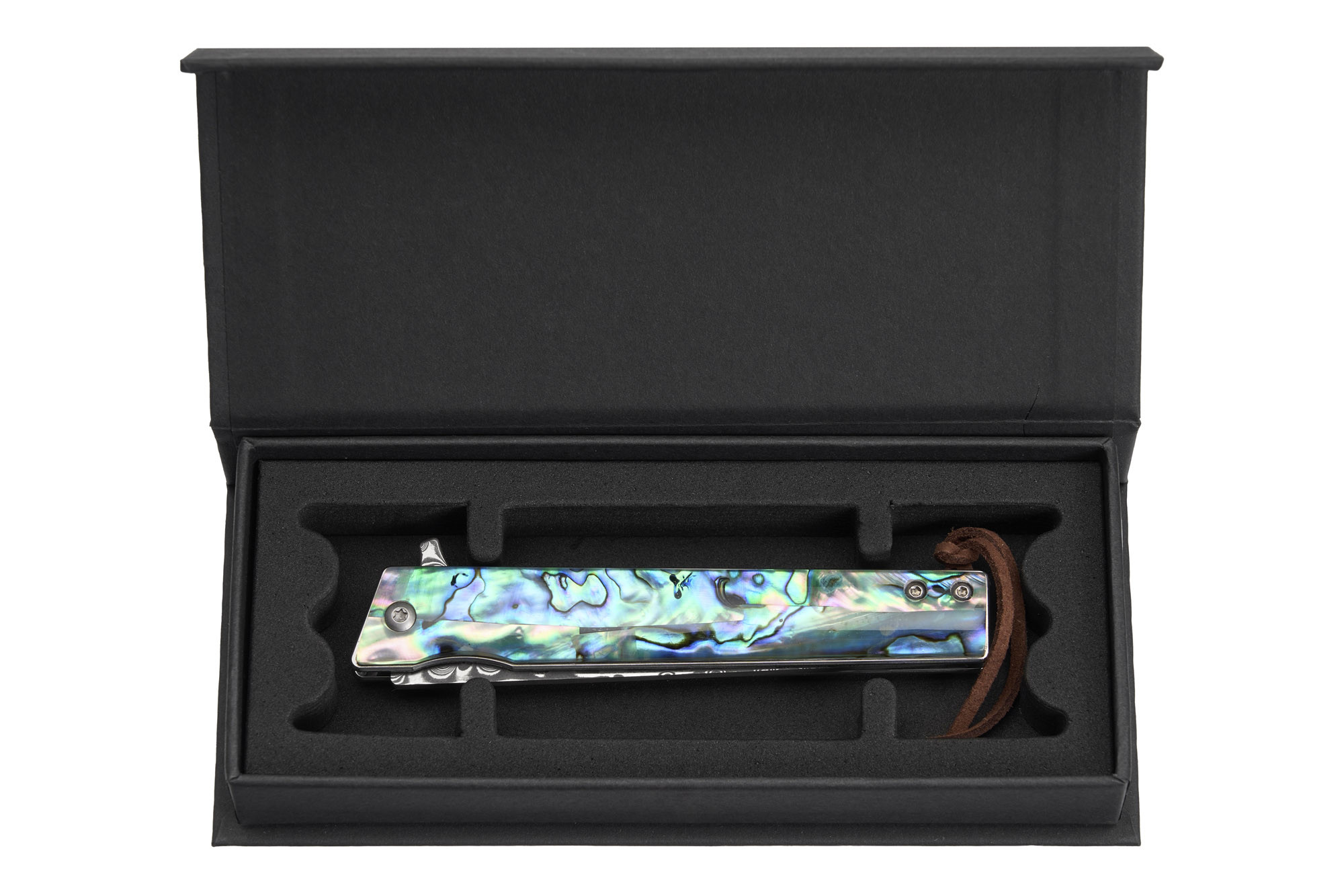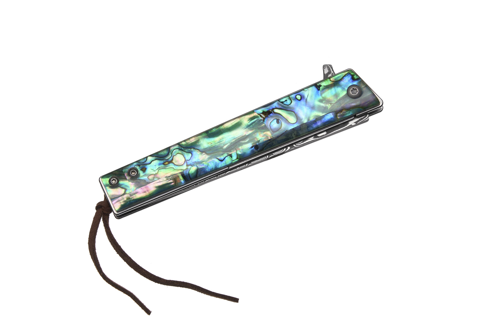 - Руків'я ножа виготовлене із сталі та полімерних накладок "під перламутр", що надає його зовнішньому вигляду додаткових балів у категоріях шикарності та солідності.
