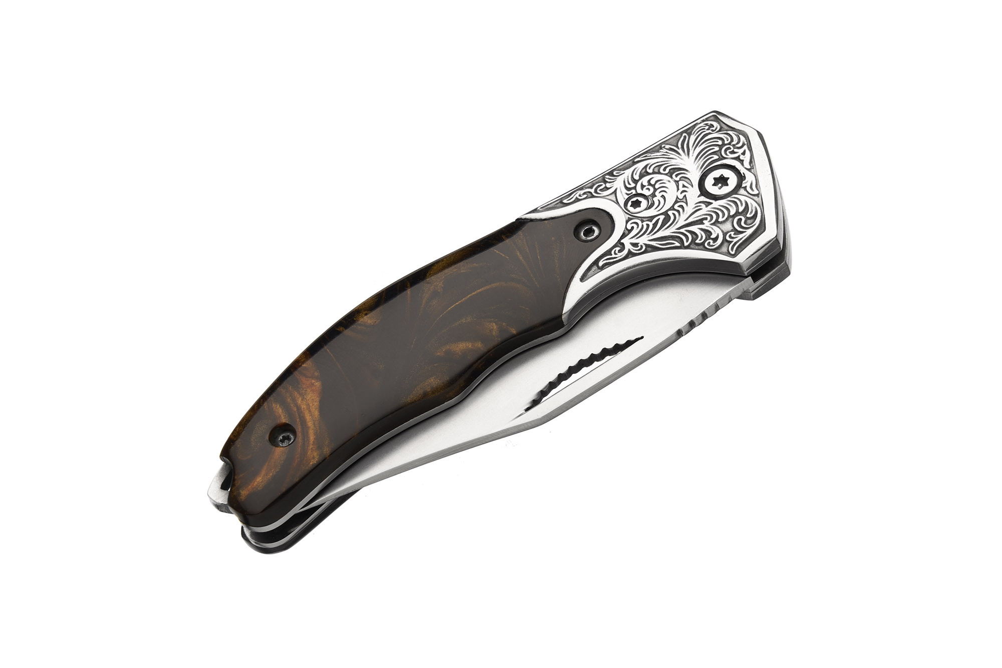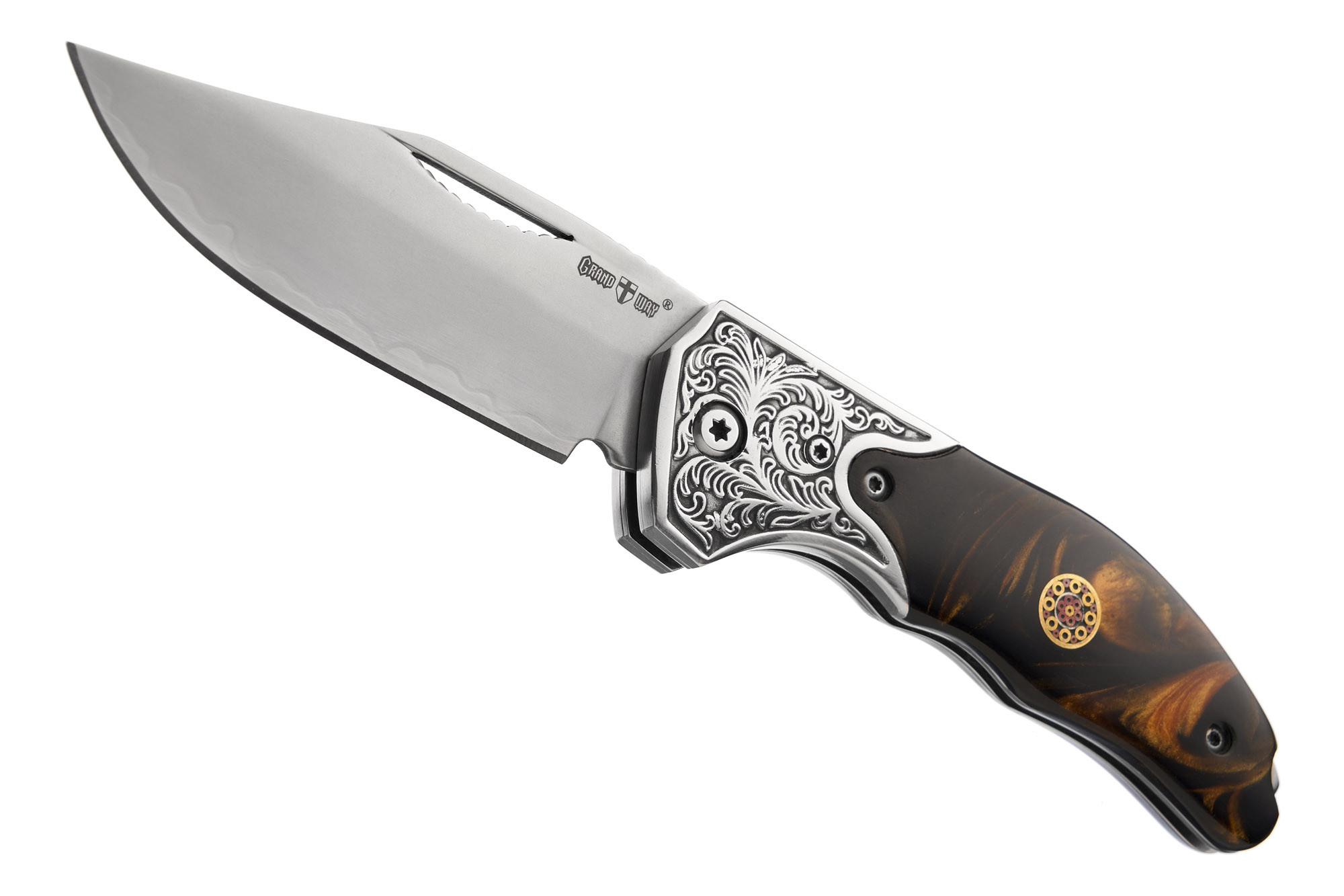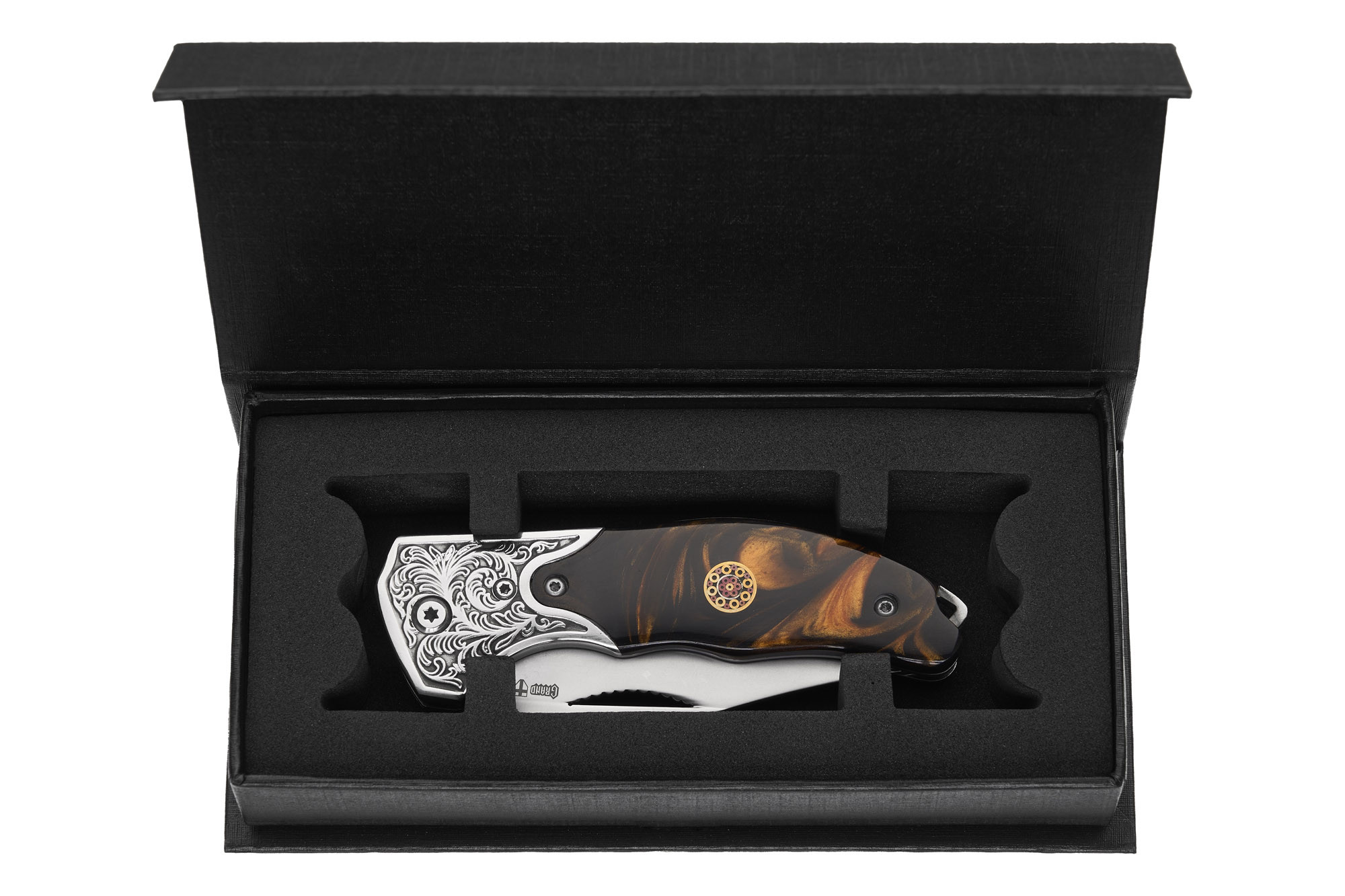 Руків'я виконане з цінних порід дерева та відполіроване до глибокого блиску. Воно прикрашене декоративними латунними елементами. Сталеві елементи руків'я доповнені травленим орнаментом, що створює відчуття справжнього колекційного виробу. Усередині руків'я знаходяться сталеві лайнери — інший хребет усієї конструкції.