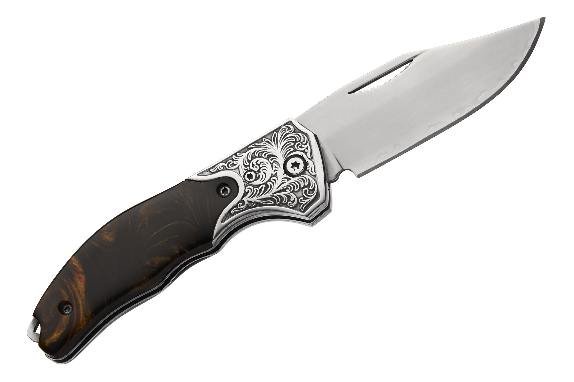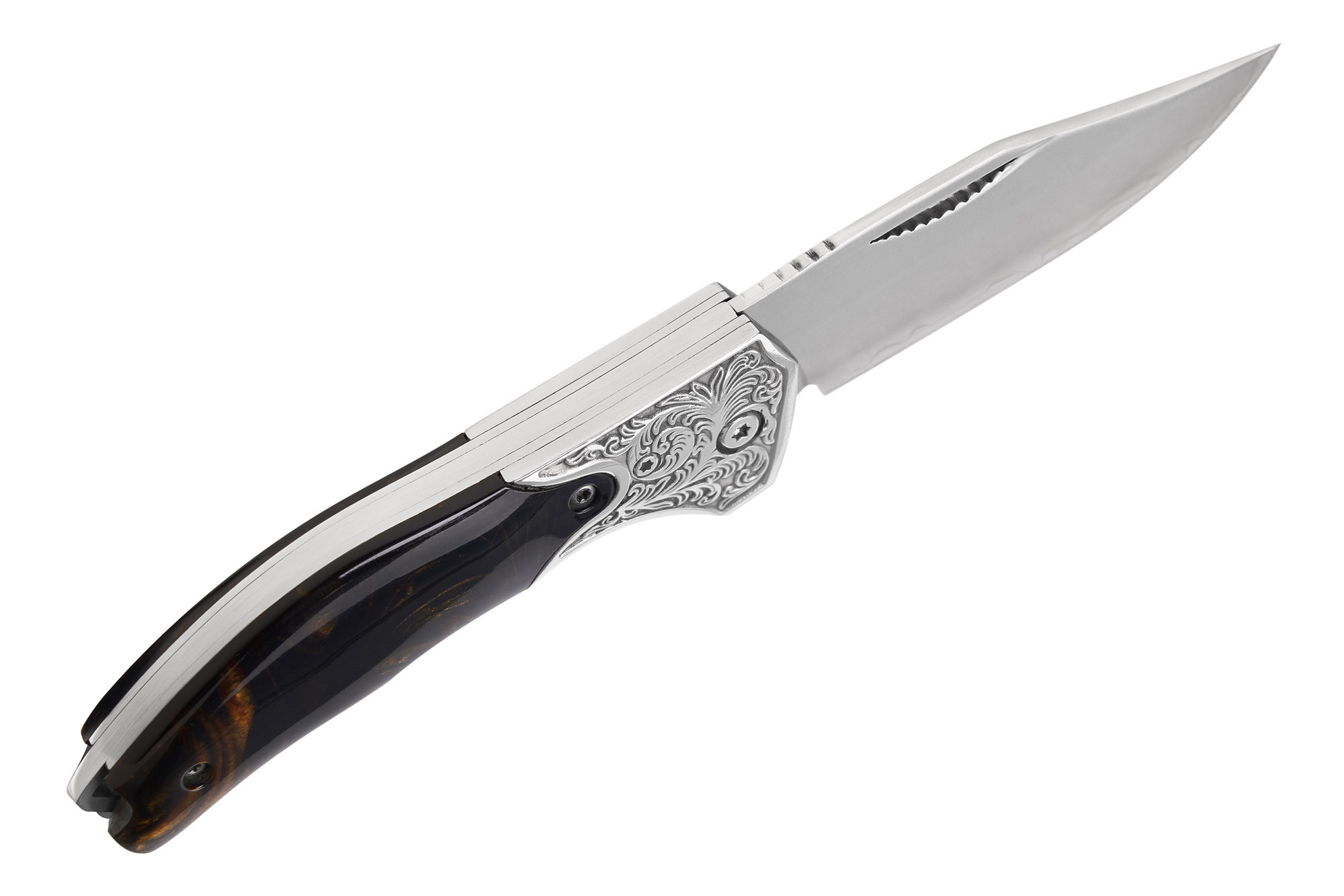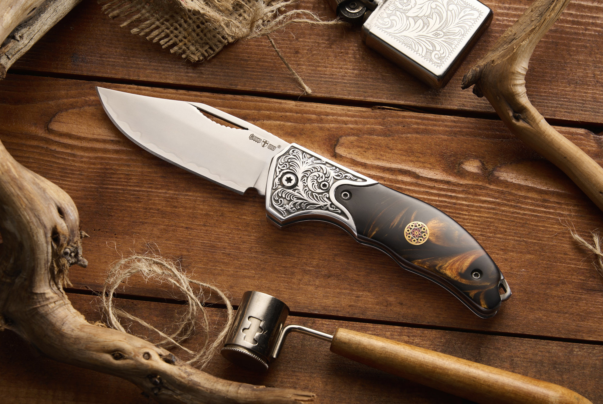 Руків'я виконане з цінних порід дерева та відполіроване до глибокого блиску. Воно прикрашене декоративними латунними елементами. Сталеві елементи руків'я доповнені травленим орнаментом, що створює відчуття справжнього колекційного виробу. Усередині руків'я знаходяться сталеві лайнери — інший хребет усієї конструкції.