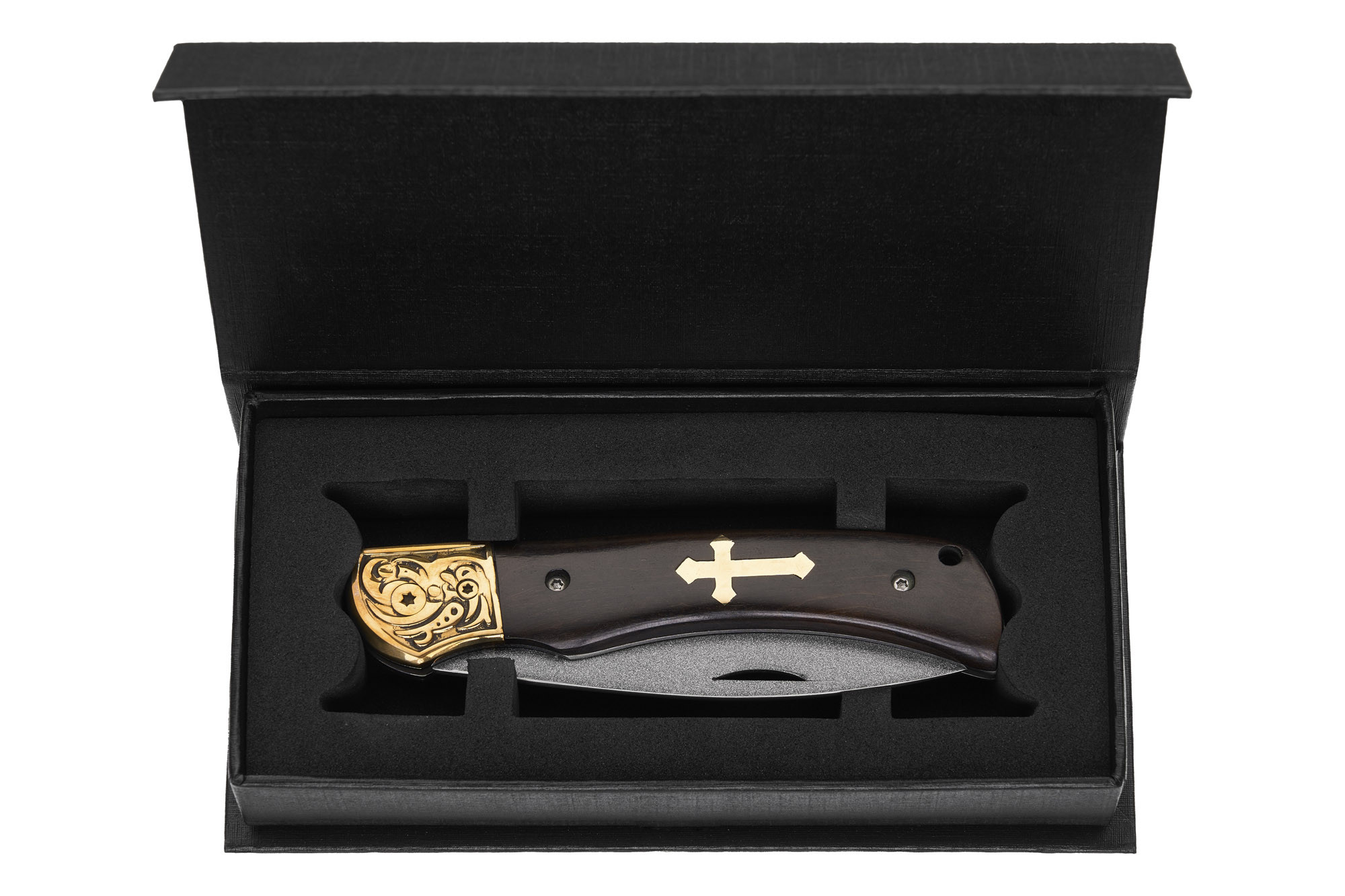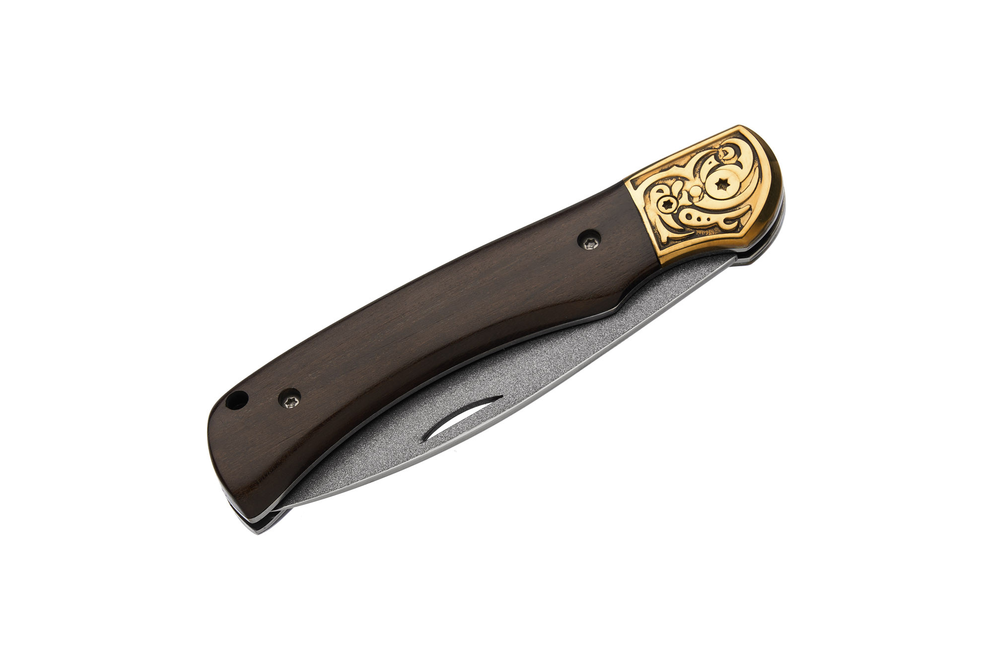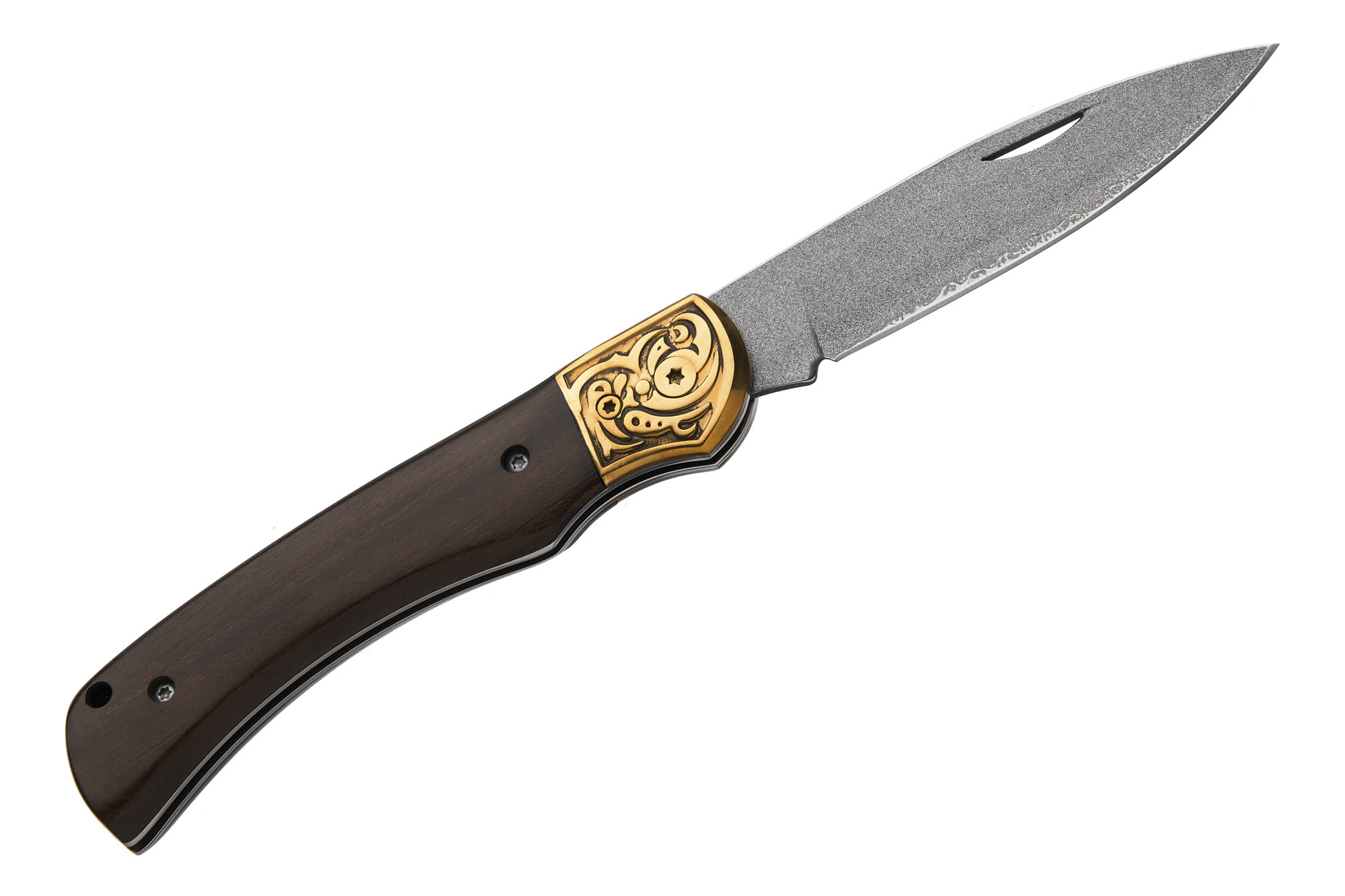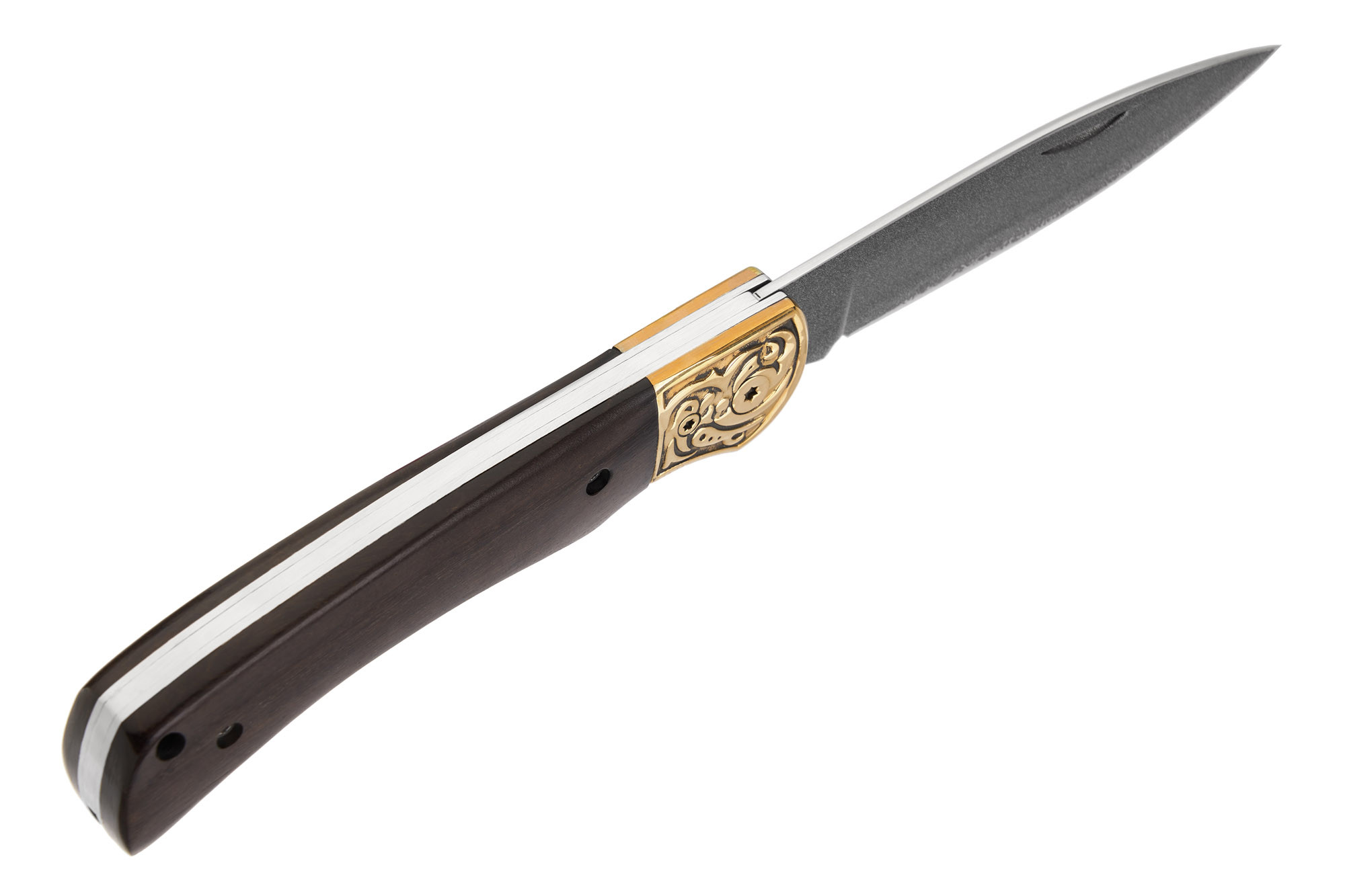 Руків’я ножа виготовлене зі сталі та горіхового дерева, прикрашене латунними елементами та травленням, що підкреслює класичний стиль і витонченість виробу.