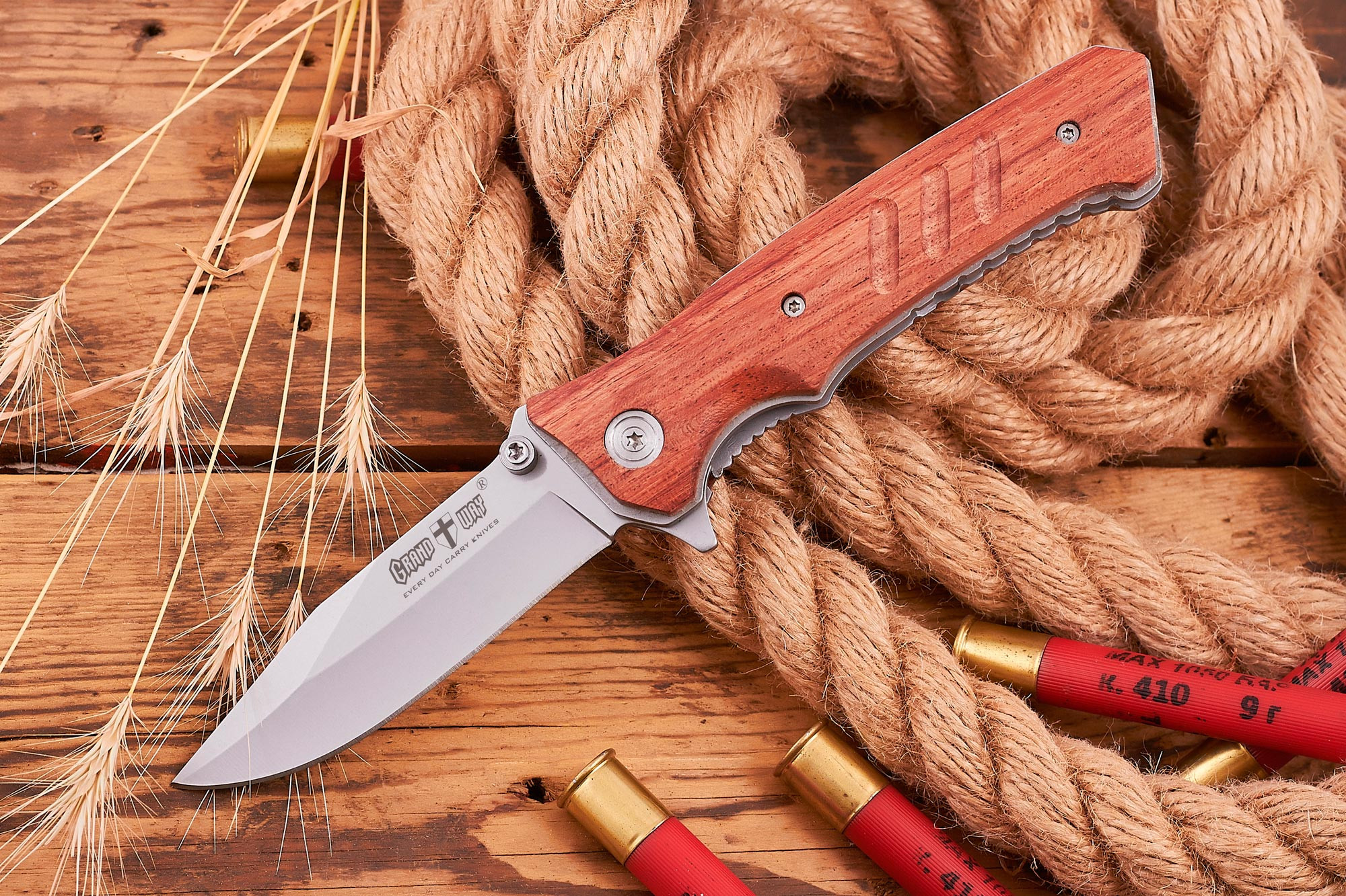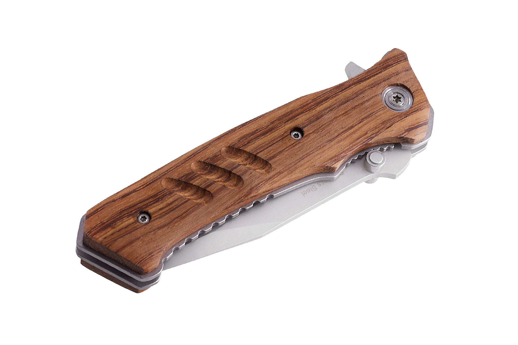 Нож с деревянными накладками и упором на клинке из 420 стали. Сталь марки 420 - это отработанная в производстве нержавеющая сталь бюджетного сегмента. Относительно небольшое содержание углерода делает эту сталь вязкой и исключительно стойкой к ржавчине. Небольшое содержание углерода также положительно влияет и на прочность: такая сталь менее хрупкая. Возможно, лезвия таких ножей тупятся чуть быстрее более дорогих марок, но и точится она тоже очень легко и буквально на всем: мусаты, любые точильные камни и даже V-образные точилки без усилий приведут затупившийся нож в боевую форму без затруднений, а твердости хватит с избытком для бытовых задач.