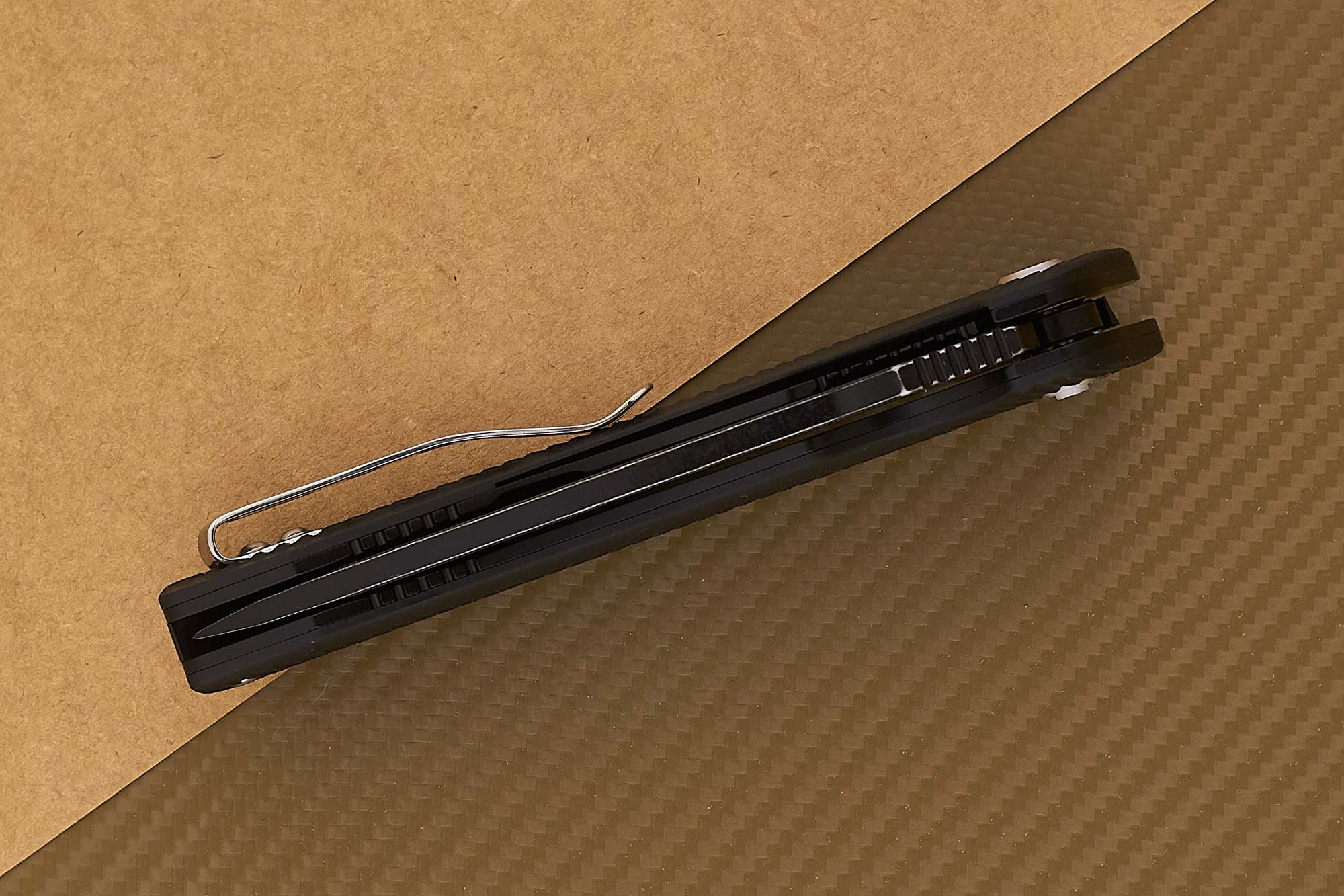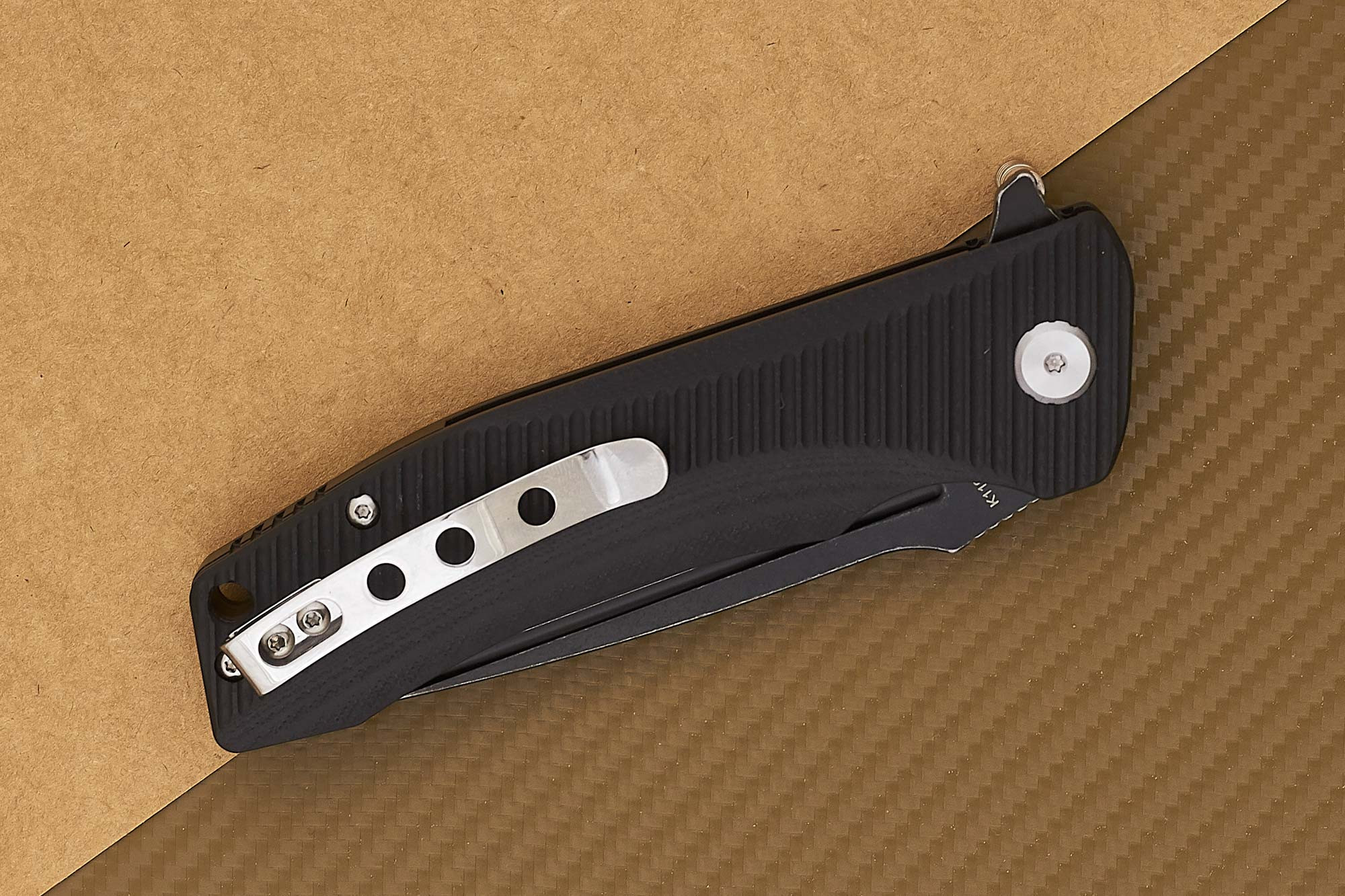 Как уже упоминалось, рукоять ножа состоит из пары облегчённых выштамповками стальных лайнеров, покрытых накладками из G10. В торцевой части имеется композитный же бекспейсер и темлячное отверстие. Клипса стальная, глубокая, не переставляемая.