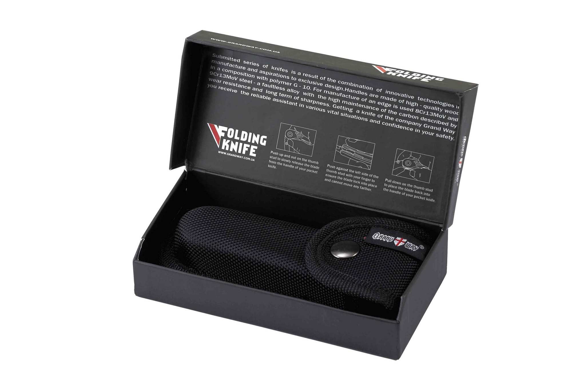 Нож поставляется в фирменной коробочке современного дизайна с магнитной защелкой и комплектуется чехлом из кордуры.