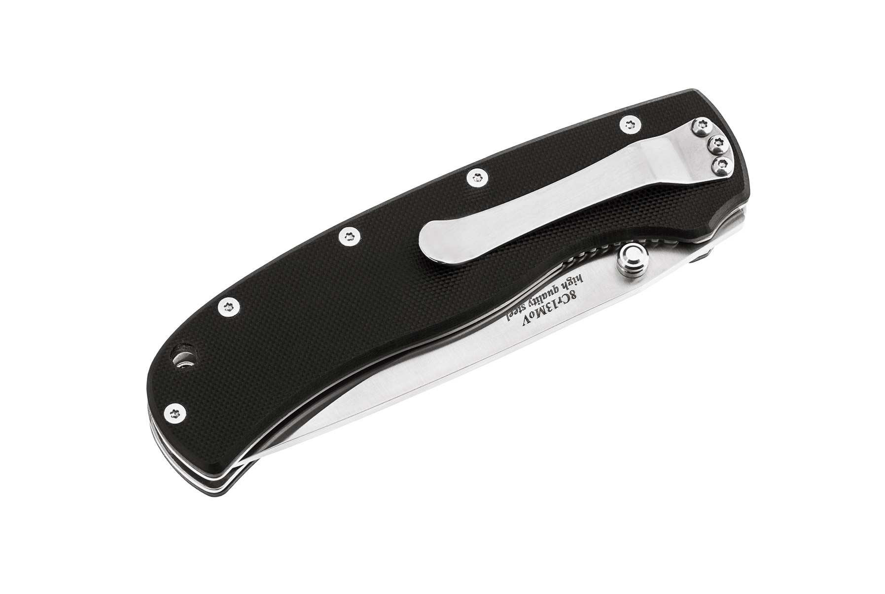 Прочному складному ножу нужен надежный замок – в этом ноже это хорошо себя зарекомендовавший линейный замок «Liner Lock». Замок надежен в своей простоте, отработан в производстве и крайне неприхотлив. Уникальная эргономичная форма рукояти безопасна в работе и обеспечивает множество разнообразных хватов для комфортного выполнения любых типов работ.Накладки рукояти изготовлены из композитного материала G-10 черного цвета - стеклопластика высокого качества. Композиция фенольных смол и стекловолокна обладает замечательной прочностью, маслобензостойкостью, устойчивостью к влаге, не проводит электрический ток, долговечна и технологична. Шероховатые накладки из G-10 приятны на ощупь и не скользят даже в мокрой руке.Шпенек на клинке и конструкция замка позволяют открывать и складывать нож одной рукой. Наличие клипсы обеспечивает удобное постоянное ношение ножа с собой.
