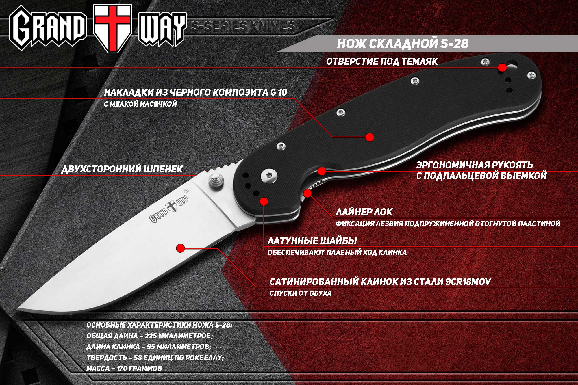В общем, S-28 – очень интересный нож, который удобно лежит в руке, отлично режет, а сталь 9Сr18MoV долго держит заточку. 9Сr18MoV – китайская нержавеющая сталь, отличающаяся повышенным содержанием углерода и хрома, является близким аналогом стали AUS-10.