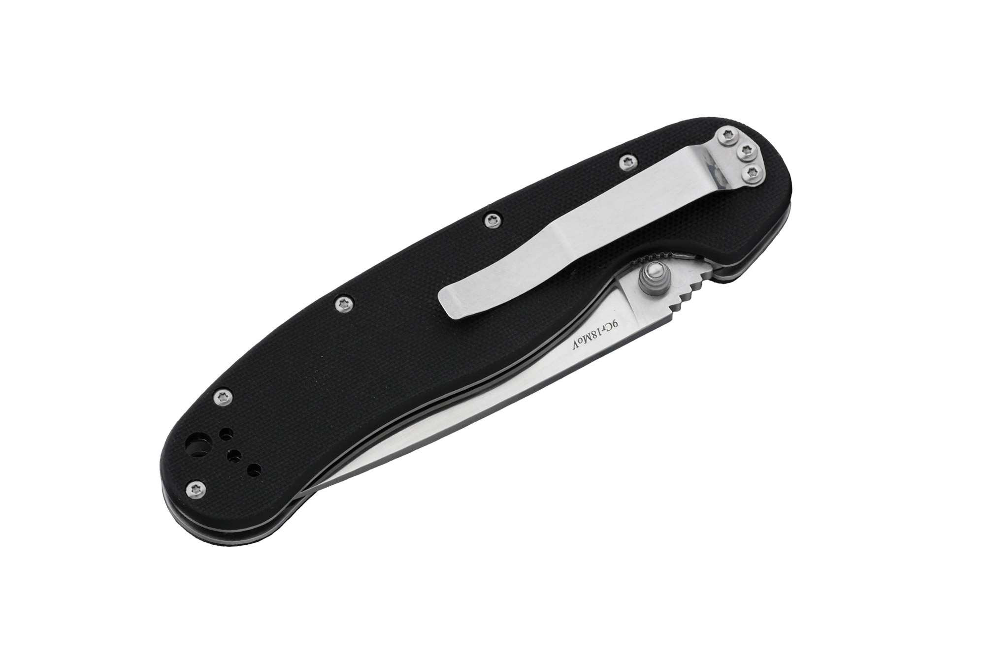 Рукоять имеет отличную эргономику – нож сразу хорошо и надежно ложится в ладонь, благодаря отличной «цеплючести», которую дают безупречно подогнанные плашки черного цвета из композита G10. Несмотря на то, что рукоять довольно длинная и крупная, она просто отлично ложится в руку. Клипса – крепкая, жесткая и в меру широкая, отверстия для ее перестановки позволяют ставить ее в любое из четырех возможных положений.