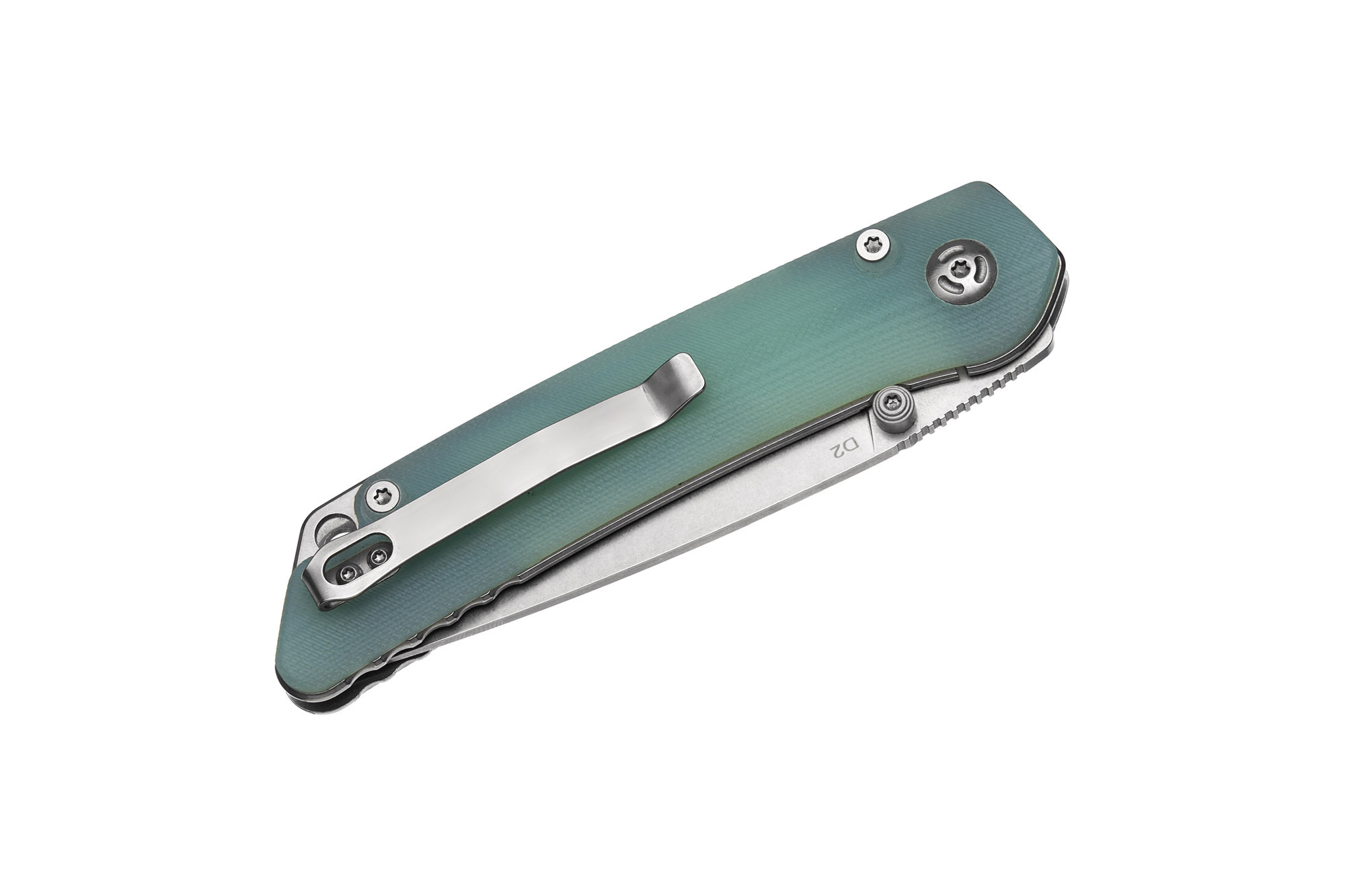 Руків’я складається з пари сталевих лайнерів з накладками з чорного G10, стійкого до води та перепадів температур. Накладки спеціально виконані так, що не покривають лайнери повністю, в результаті чого чорні плашки мають елегантну окантовку з блискучої на сонці полірованої сталі. Завдяки цьому дизайнерському рішенню, ніж виглядає стильно і красиво.