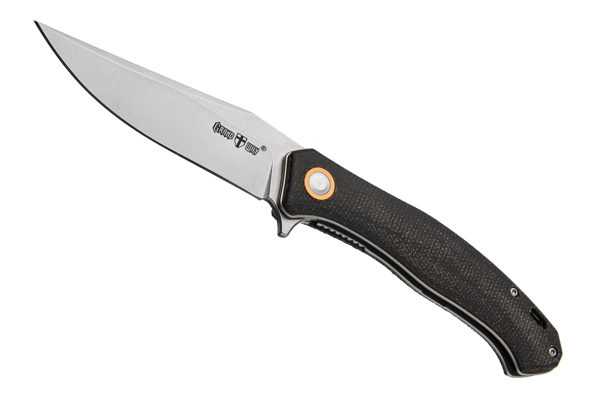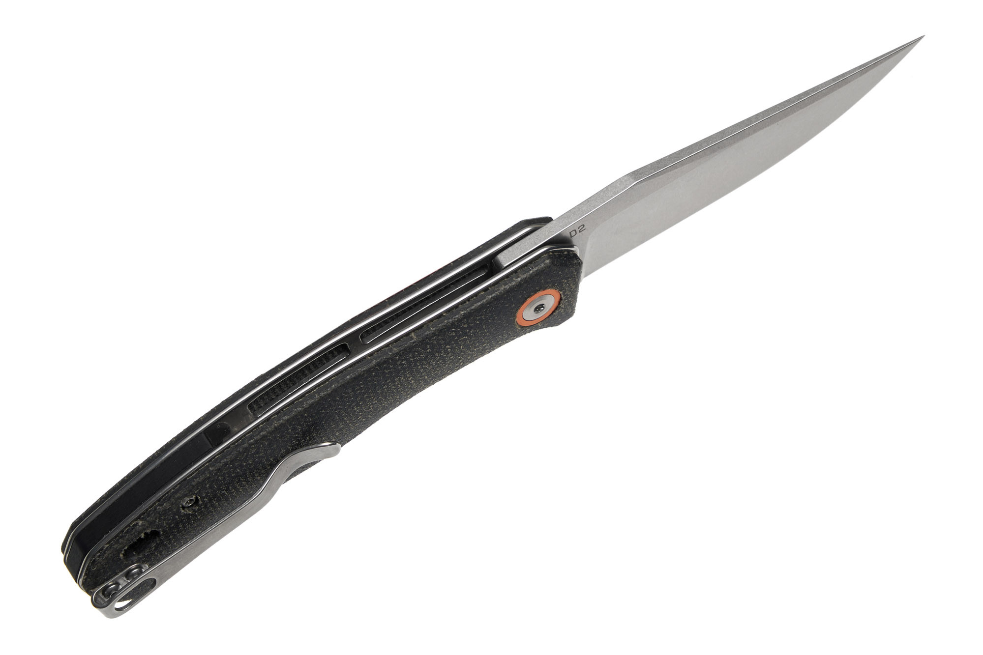 - Високу якість використаних матеріалів. Клинок довжиною 80 мм зроблений зі сталі D2 (про її переваги трохи нижче). Накладки руків’я зроблені з мікарти чорного кольору. Матеріал приємно шорсткий, приємно чіпляється за долоню і, до всього іншого, має чудову стійкість до механічного зносу, впливу води та високих температур. Руків’я зручно лежить у долон. Помітний вигин руків’я додатково фіксує ніж у руці. У тильній частині руків’я розташована сталева кліпса для носіння ножа на кишені та темлячний отвір.