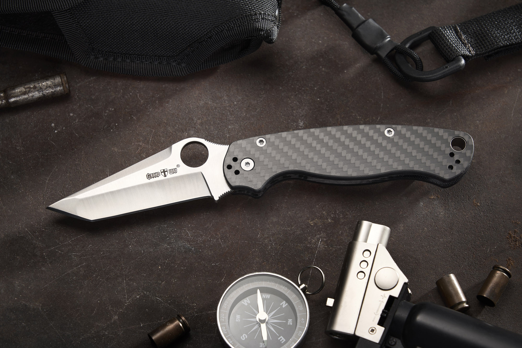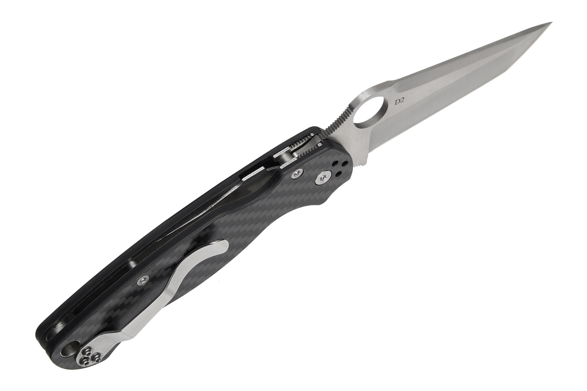 Крім дуже вдалого дизайну, надійного та зручного замка компрешн лок, та дуже зручного способу відкривання тим самим отвором,цей тип ножа відомий клинком типу “трійний клин”. Ця геометрія дозволяє ножу дуже гарно різати та колоти але має один помітний недолік – ті люди, що використовують свій ніж у особливо важких умовах зазвичай дуже переживають, що його дуже гостре та тонке вістря легко зламати при грубому повдоженні із ножем. І саме ця частина ножоманської громадскості довго прохала виробників зробити ніж з тією ж дивною ергономікою, але більш міцним (і нехай може не таким різучим) клинком. Так з’явився вариант ножа із клинком типу танто – товстішим і потужнішим клинком з дуже міцним вістрям. Докладніше про клинки типу “американський танто” ви можете дізнатись із статті у нашому блозі. Ми лише відмітимо, що одним (але не єдиним) плюсом цього ножового профілю вважається дуже міцний кінчик клинка.