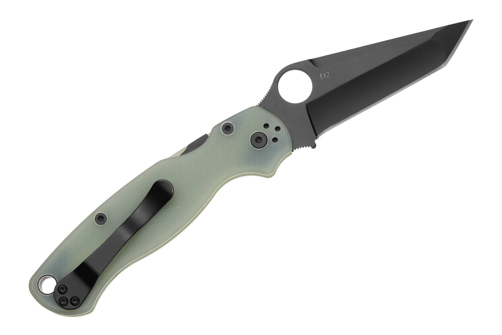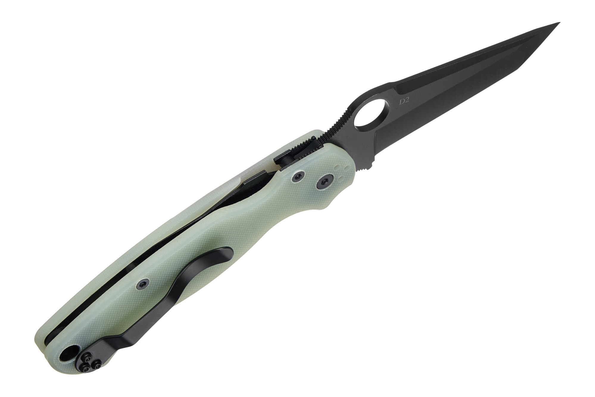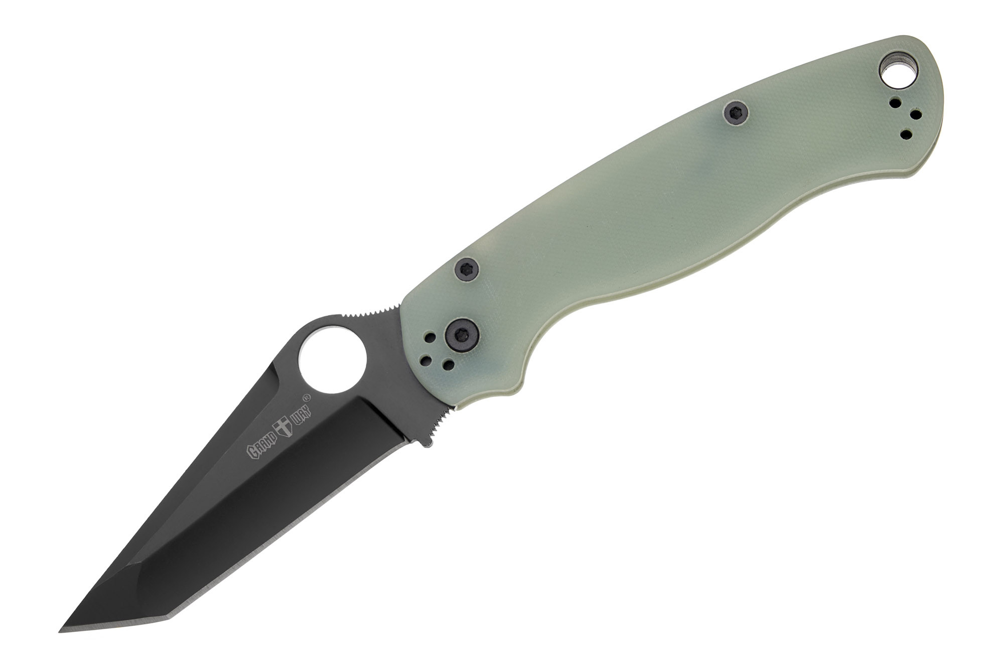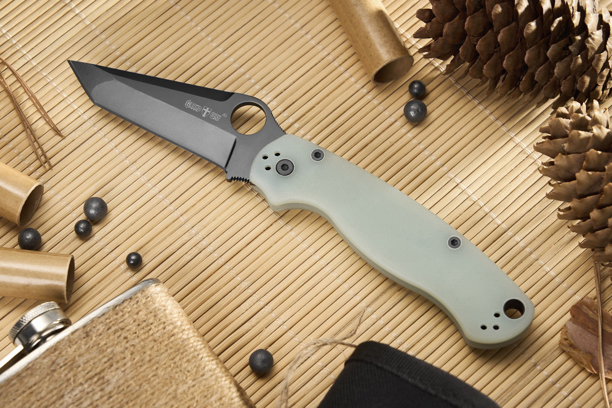 Крім дуже вдалого дизайну, надійного та зручного замка компрешн лок, та дуже зручного способу відкривання тим самим отвором,цей тип ножа відомий клинком типу “трійний клин”. Ця геометрія дозволяє ножу дуже гарно різати та колоти але має один помітний недолік – ті люди, що використовують свій ніж у особливо важких умовах зазвичай дуже переживають, що його дуже гостре та тонке вістря легко зламати при грубому повдоженні із ножем. І саме ця частина ножоманської громадскості довго прохала виробників зробити ніж з тією ж дивною ергономікою, але більш міцним (і нехай може не таким різучим) клинком. Так з’явився вариант ножа із клинком типу танто – товстішим і потужнішим клинком з дуже міцним вістрям. Докладніше про клинки типу “американський танто” ви можете дізнатись із статті у нашому блозі. Ми лише відмітимо, що одним (але не єдиним) плюсом цього ножового профілю вважається дуже міцний кінчик клинка.