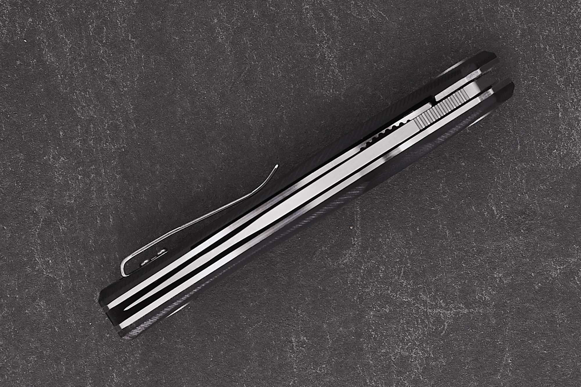 Клипса стальная, полированная, украшена логотипом RSK. Переустановка клипсы на левую сторону рукояти не предусмотрена. Да и сама рукоять выполнена ассиметричной, под правую руку. Такое решение ещё больше улучшает эргономику ножа, но вам стоит учитывать, что левшам данный складень не подойдёт.