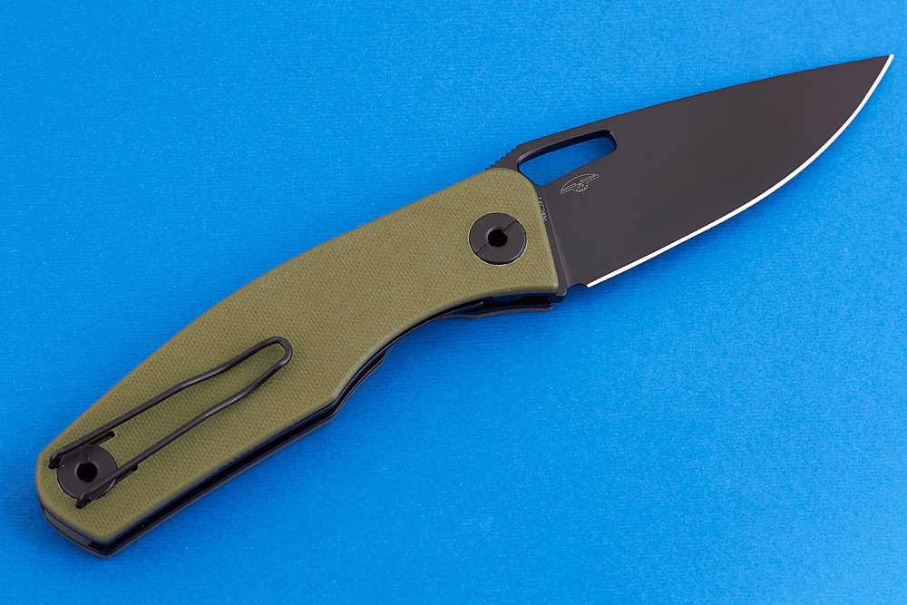 Сам клинок выполнен из нержавеющей стали 14C28N, прочной и резучей. Чёрное покрытие только добавляет ему стойкости от ржавчины и царапин. Спуски клинка прямые, от обуха, образуют клин. Скруглённая форма обуха выглядит необычно, интересно, и приятна при прикосновении. У рукояти на обух нанесена насечка под палец. Примечательно, что этот участок выполнен под углом, делающим давление на клинок при силовом резе наиболее эффективным.