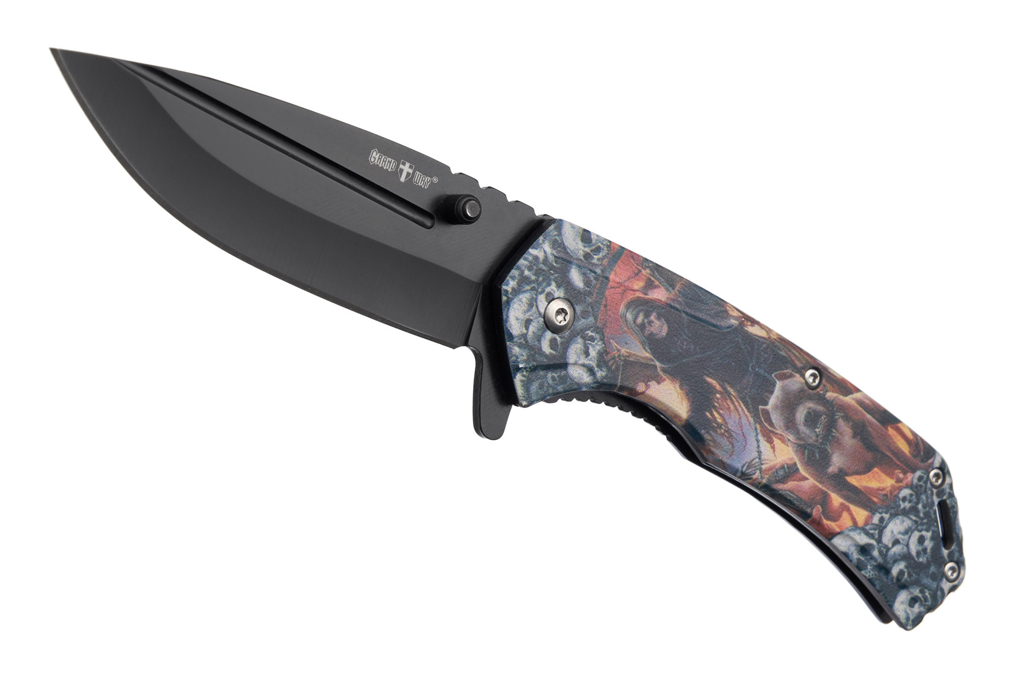 - Рукоять ножа состоит из пары прочных стальных лайнеров. Накладки рукоятей — пластиковые. Что крайне удобно, например, зимой (рукоять не будет остывать и примерзать к ладони). На накладки нанесён стильный рисунок, дополняющий общий тактический дизайн ножа.