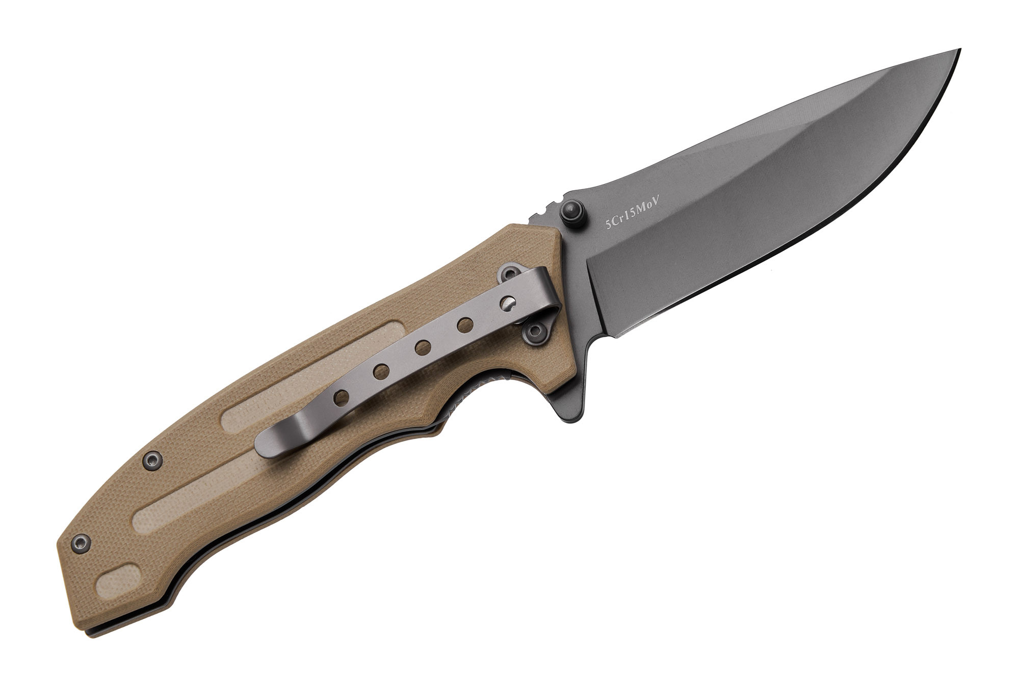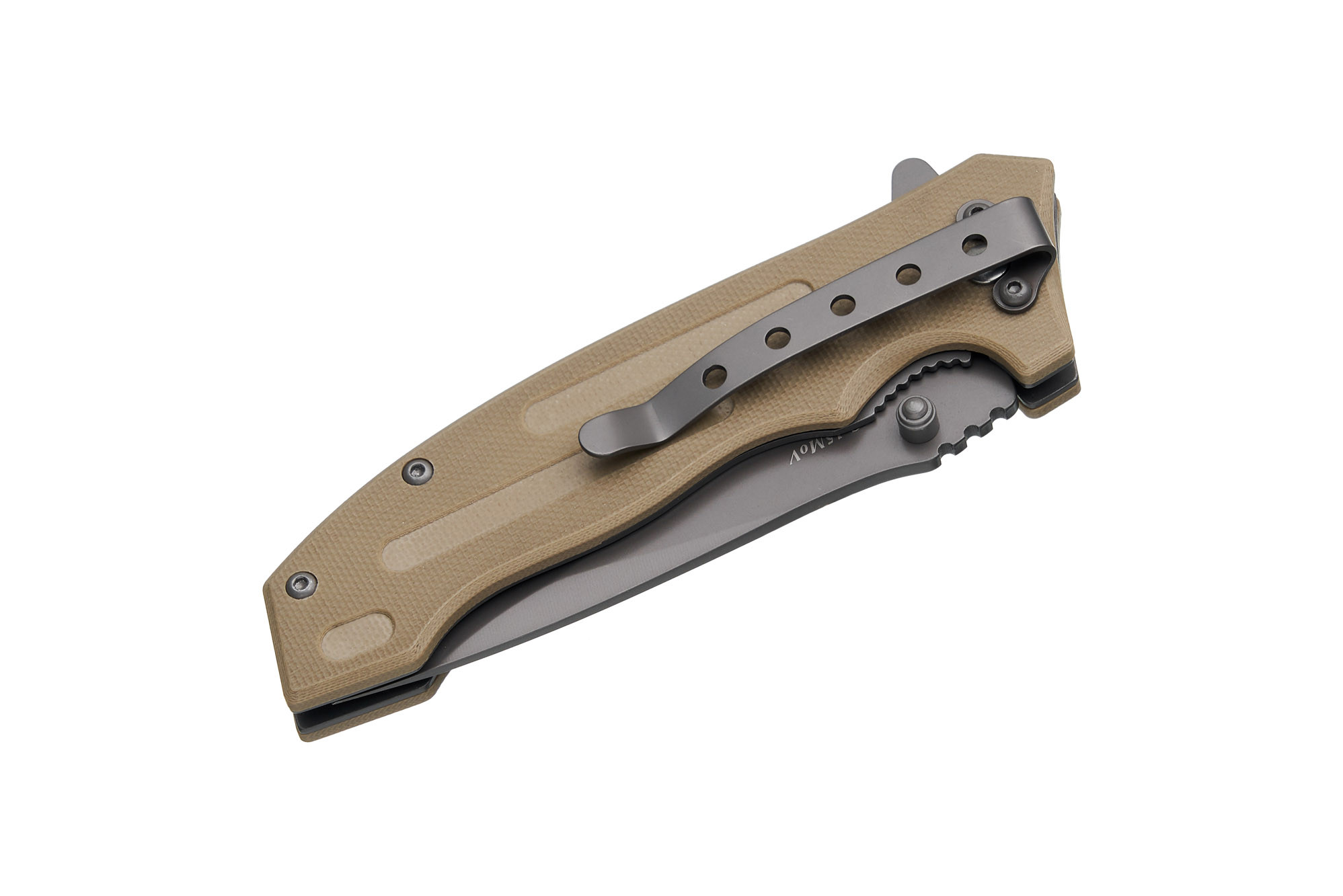 По-перше, у цього ножа доволі вдалий тактичний дизайн. Матовий клинок, додатково захищений від корозії та подряпин стійким покриттям Ti-Ni(Titanium Nitride) дуже добре підходить до рукояті з накладками кольору койот (coyote).