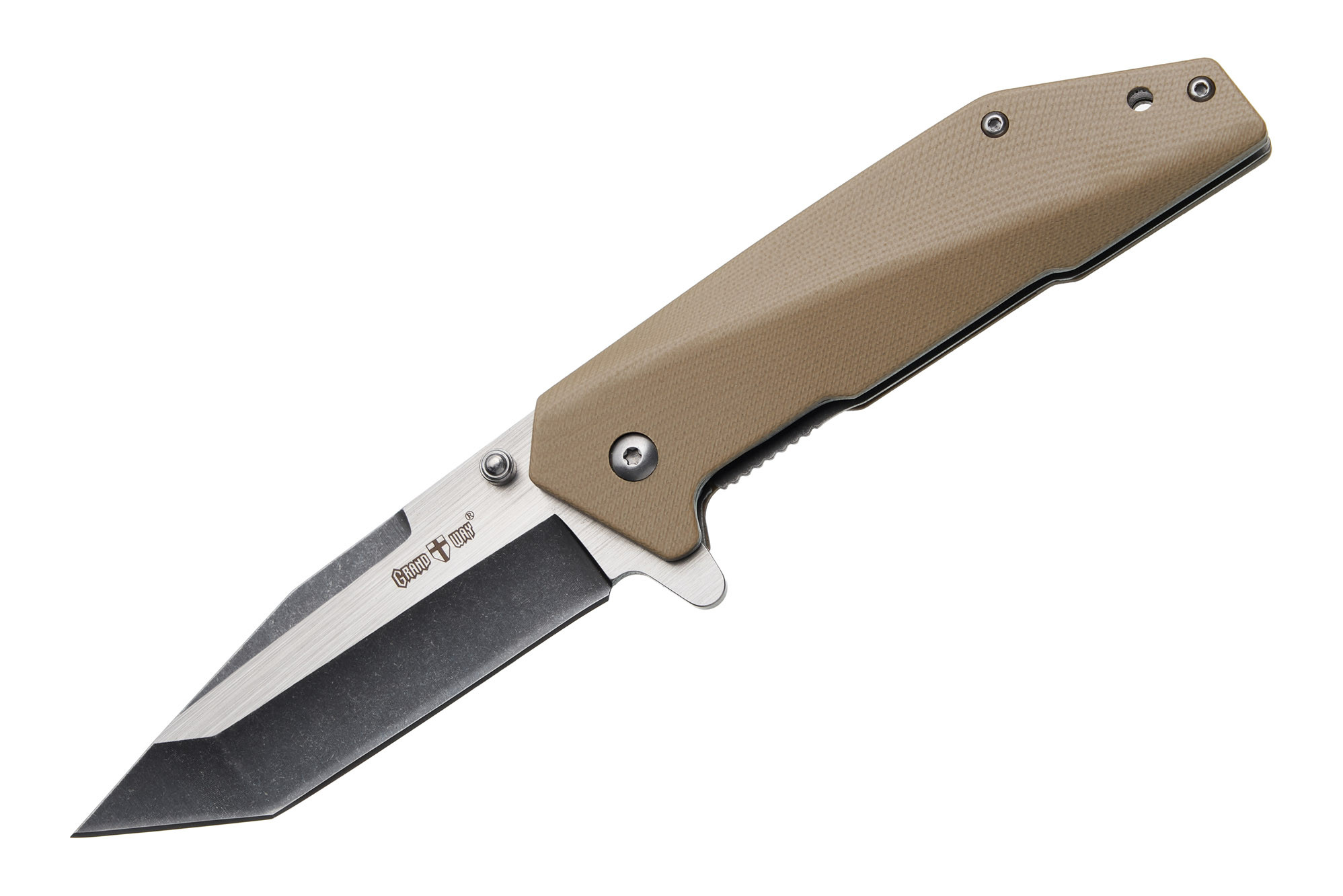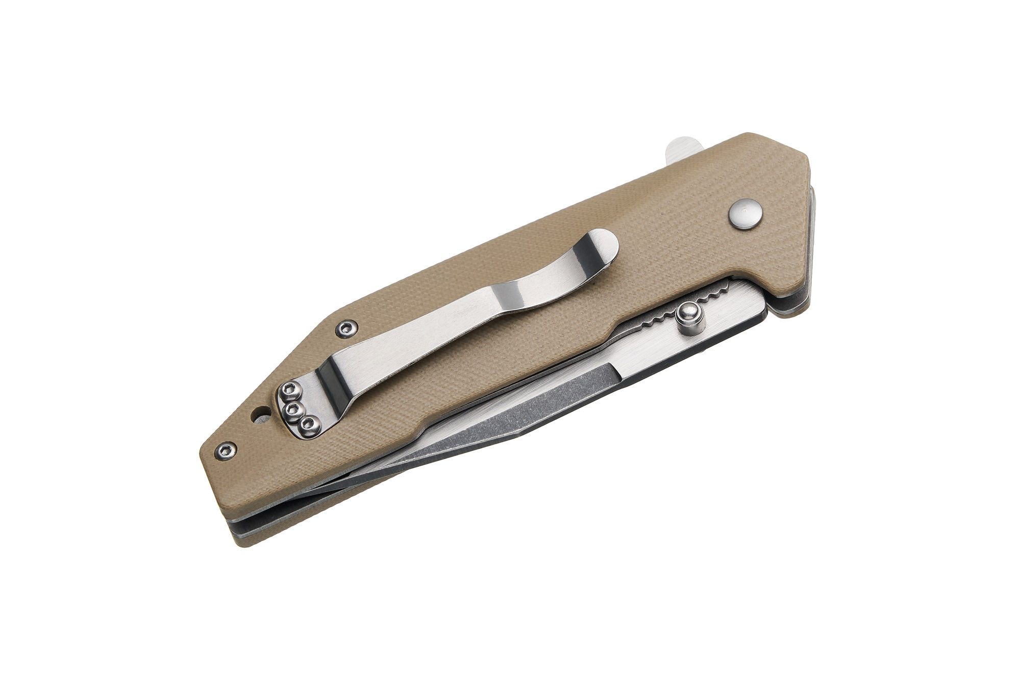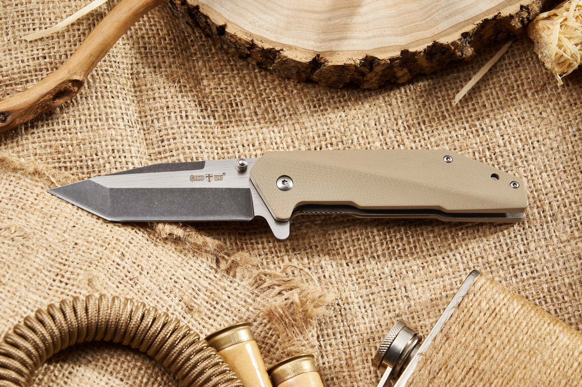 Рукоять кольору coyote (однотонний колір коричневого відтінку, що нагадує забарвлення лугового вовка – койота, який буквально зливається з місцевістю, що вигоріла під палючим південним сонцем) і клинок типу американський танто виглядають дійсно «тактикульно», добавляючи цьому ножу кілька додаткових балів у категорії «за стиль та зовнішній вигляд».