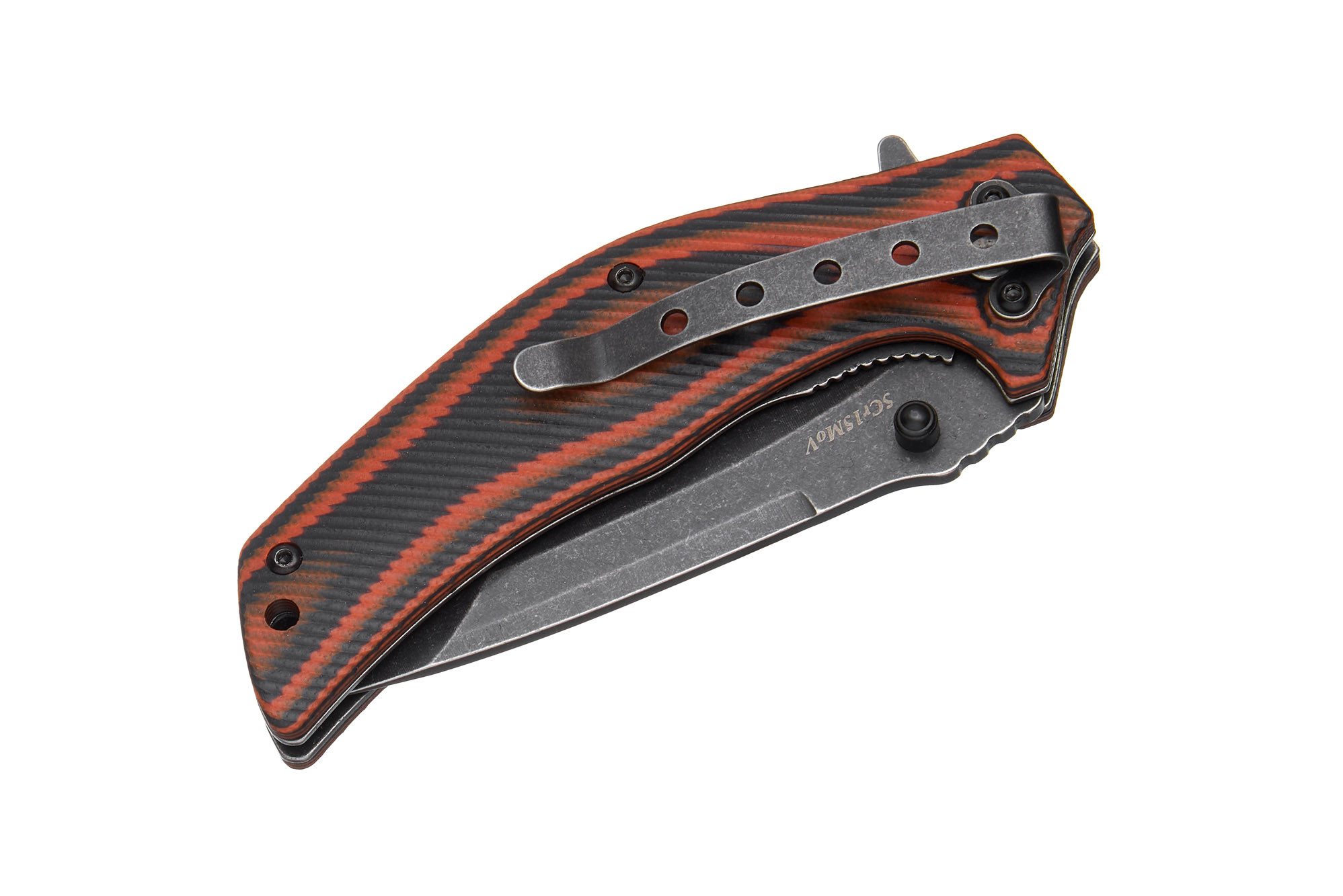 Сталева кліпса, розташована з правого боку рукояті, дозволяє надійно закріпити ніж на зрізі кишені. Також слід звернути увагу на встроєний у тильну частину рукояті карабін, що дозволяє підвісити ніж на спорядженні.