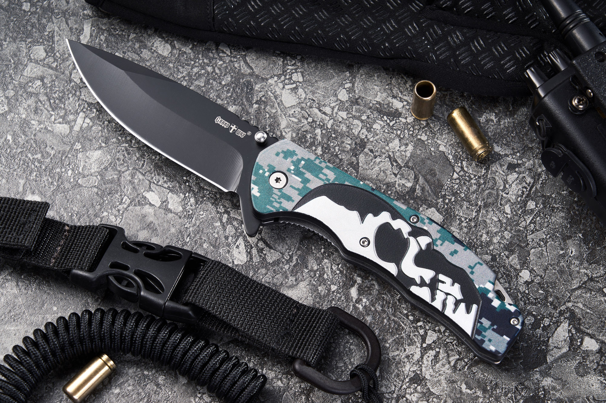 - Рукоять ножа состоит из пары прочных стальных лайнеров. Накладки рукоятей — пластиковые. Что крайне удобно, например, зимой (рукоять не будет остывать и примерзать к ладони). На накладки нанесён стильный рисунок, дополняющий общий тактический дизайн ножа.