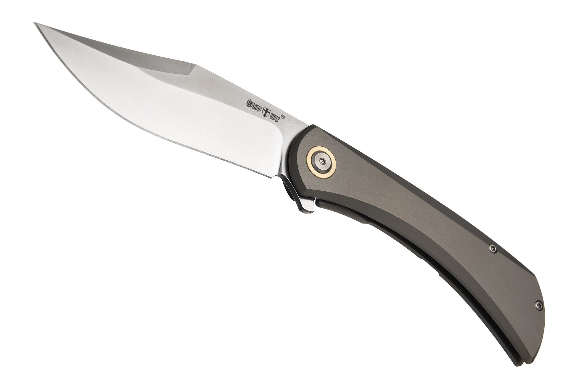 При цьому, Grand Way WK 19054 є по-справжньому сучасним поглядом на цю класику. Руків’я з титанового сплаву, клинок з якісної сталі D2, замок типу frame lock, механізм – фліппер з підшипниками в осьовому, всього цього епоха класики ще не знала.