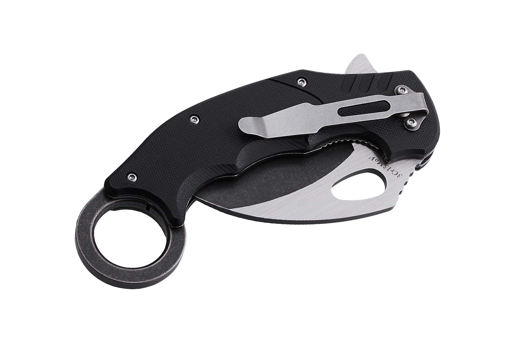 - Оканчивается нож традиционным для керамбитов кольцом, которое и улучшает, и разнообразит хват. Оно довольно крупное – сюда явно влезет палец в зимней перчатке. Для ношения на кармане на рукояти имеется съемная клипса средней жесткости.