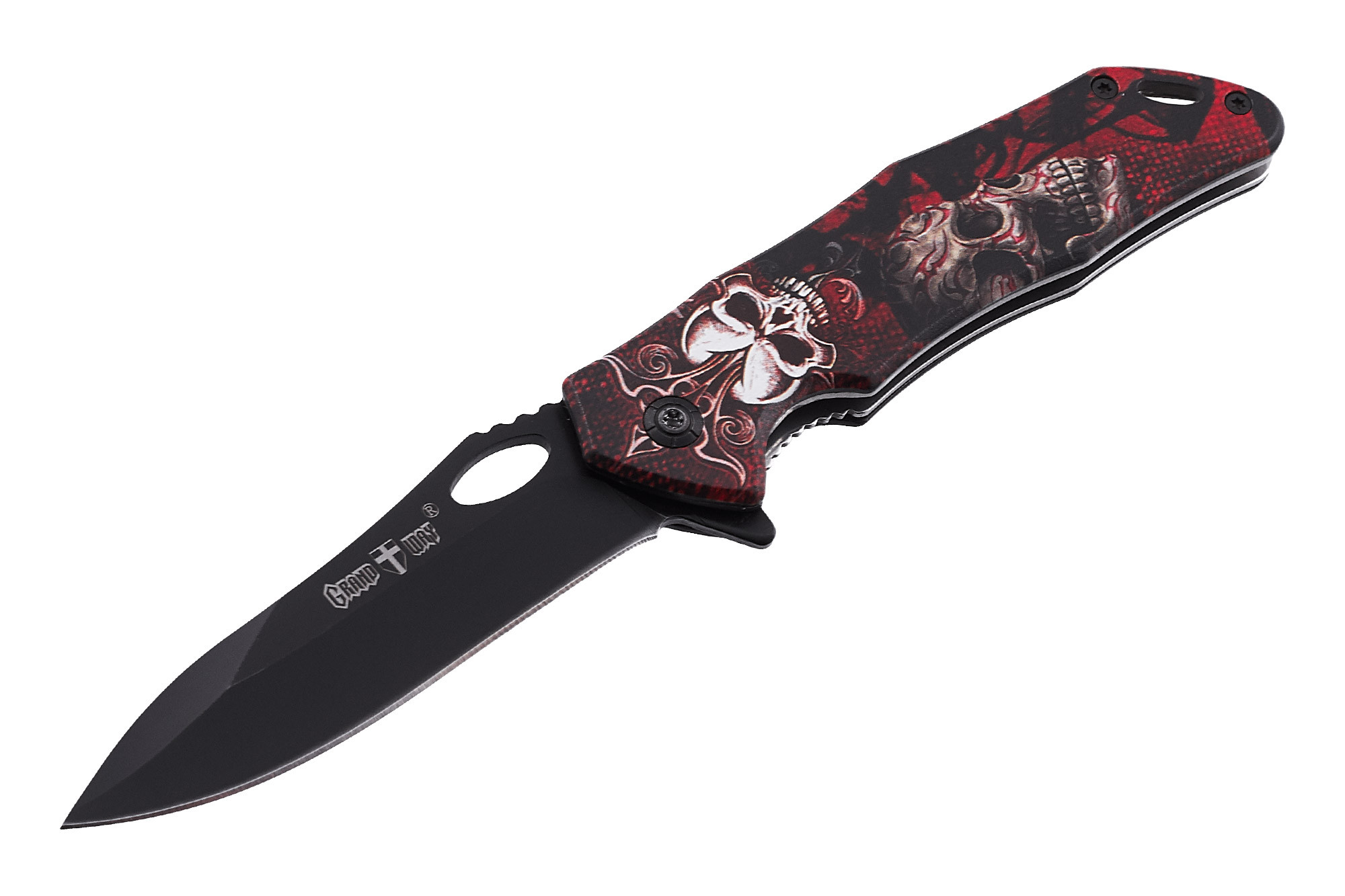 В основном, складной нож WK10034 является цельнометаллическим, даже рукоять снабжена алюминиевыми накладками с красочным принтом. Рукоятка – весьма эргономичная, с продуманной подпальцевой выемкой.