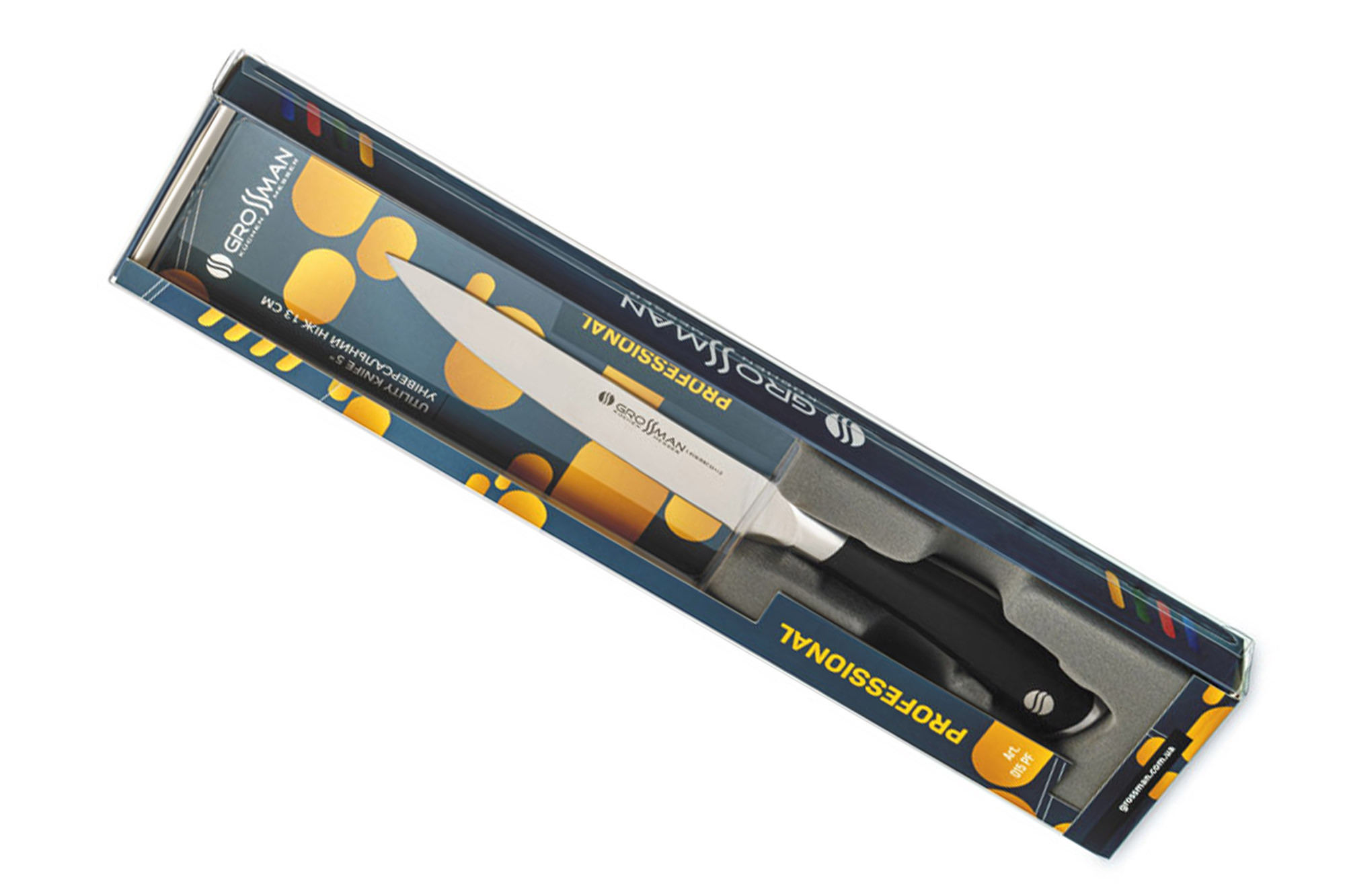 Цей міцний кухонний ніж із гострим, як бритва, клинком із круппівської нержавіючої сталі, легко шаткує, нарізає скибочками та кубиками, розкриває упаковки з напівфабрикатами та ділить на порції. Універсальний ніж GROSSMAN Professional – незамінна річ на кожній кухні. Він простий у користуванні, оснащений ергономічною ручкою і добре збалансований.