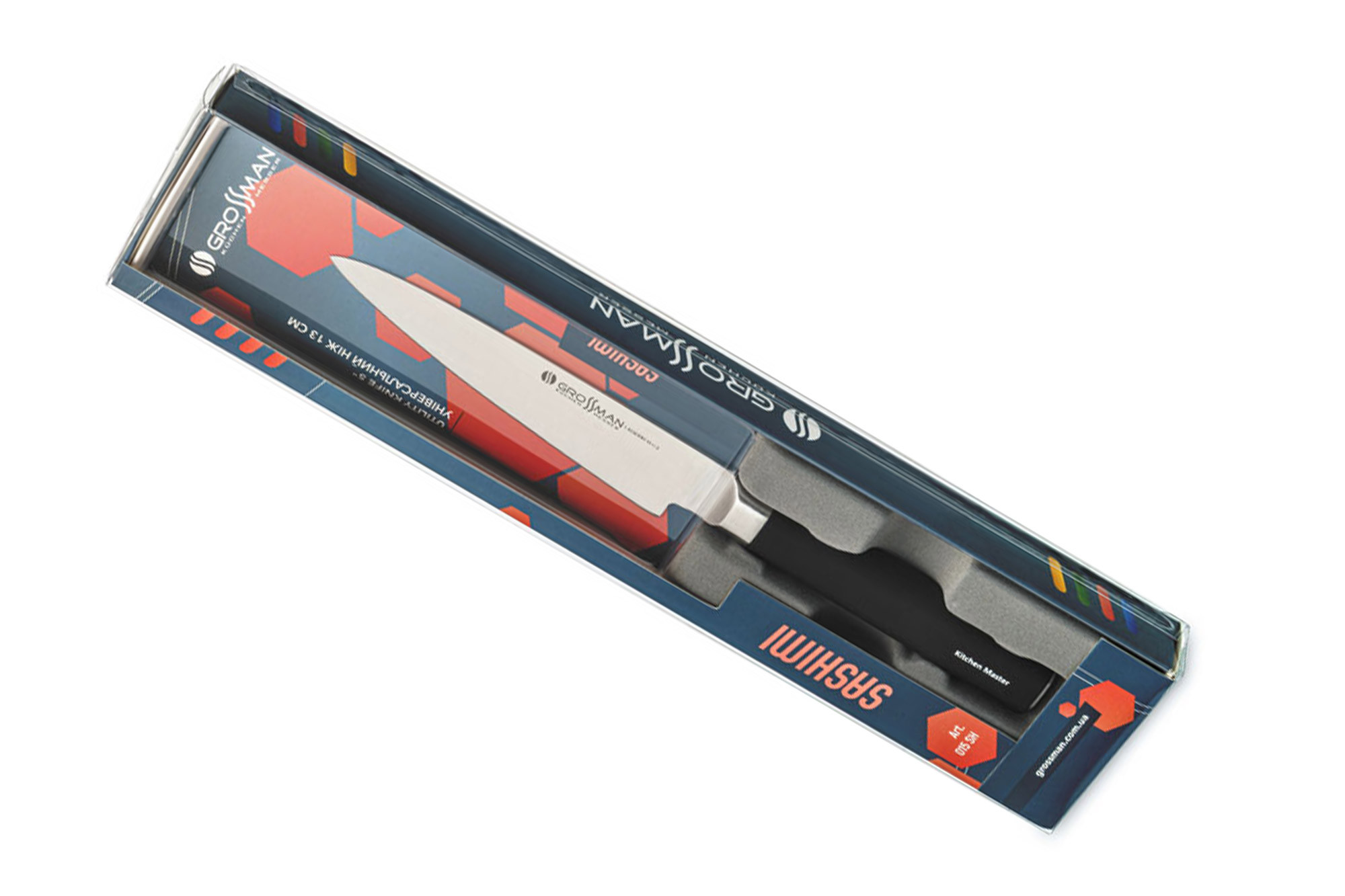 Цей міцний кухонний ніж із гострим, як бритва, клинком із круппівської нержавіючої сталі, легко шаткує, нарізає скибочками та кубиками, розкриває упаковки з напівфабрикатами та ділить на порції. Універсальний ніж GROSSMAN Sashimi – незамінна річ на кожній кухні. Він простий у користуванні, оснащений ергономічною ручкою і добре збалансований.