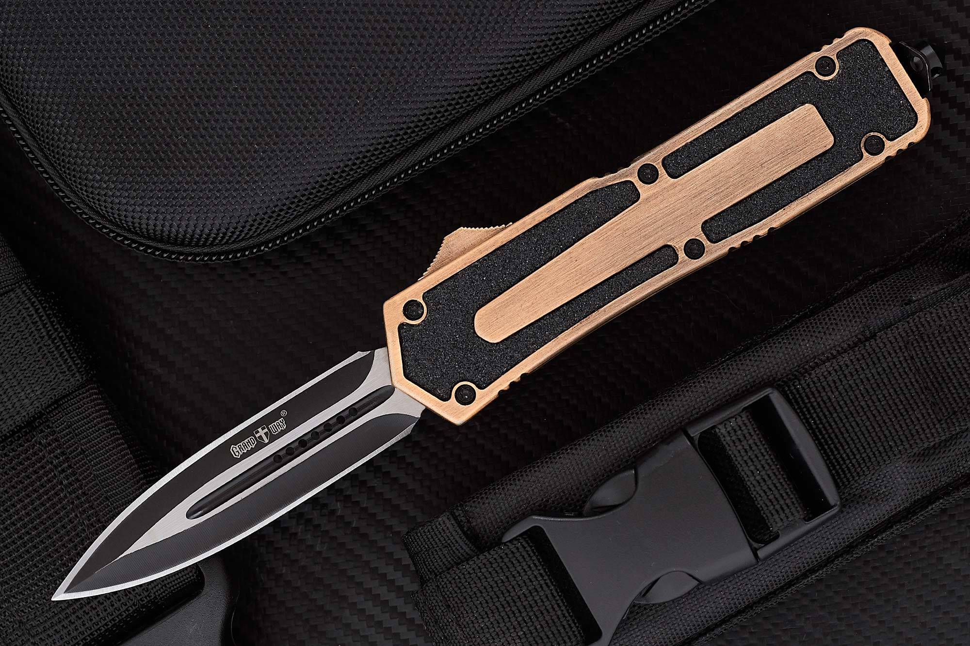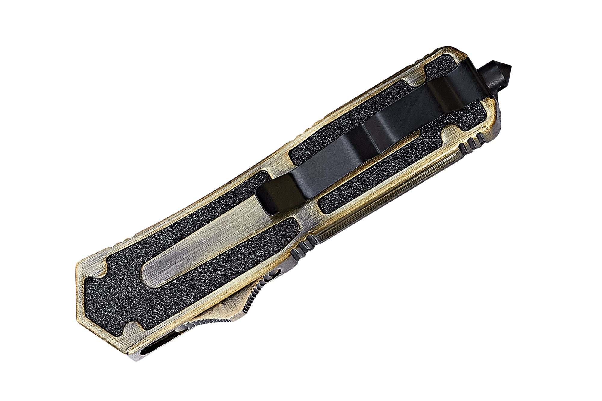 Фронтальный механизм выброса, оказал влияние и на внешний вид ножа. Рукоять (она же – корпус ножа), сделана из алюминиевого сплава, и представляет собой крепко сбитый, компактный, прямоугольный брусочек. Который, хоть и выглядит непривычно, но лежит в руке хорошо. Крепости хвата и комфорту удержания также дополнительно способствуют насечки для пальцев и шероховатые вставки на боковых поверхностях рукояти.