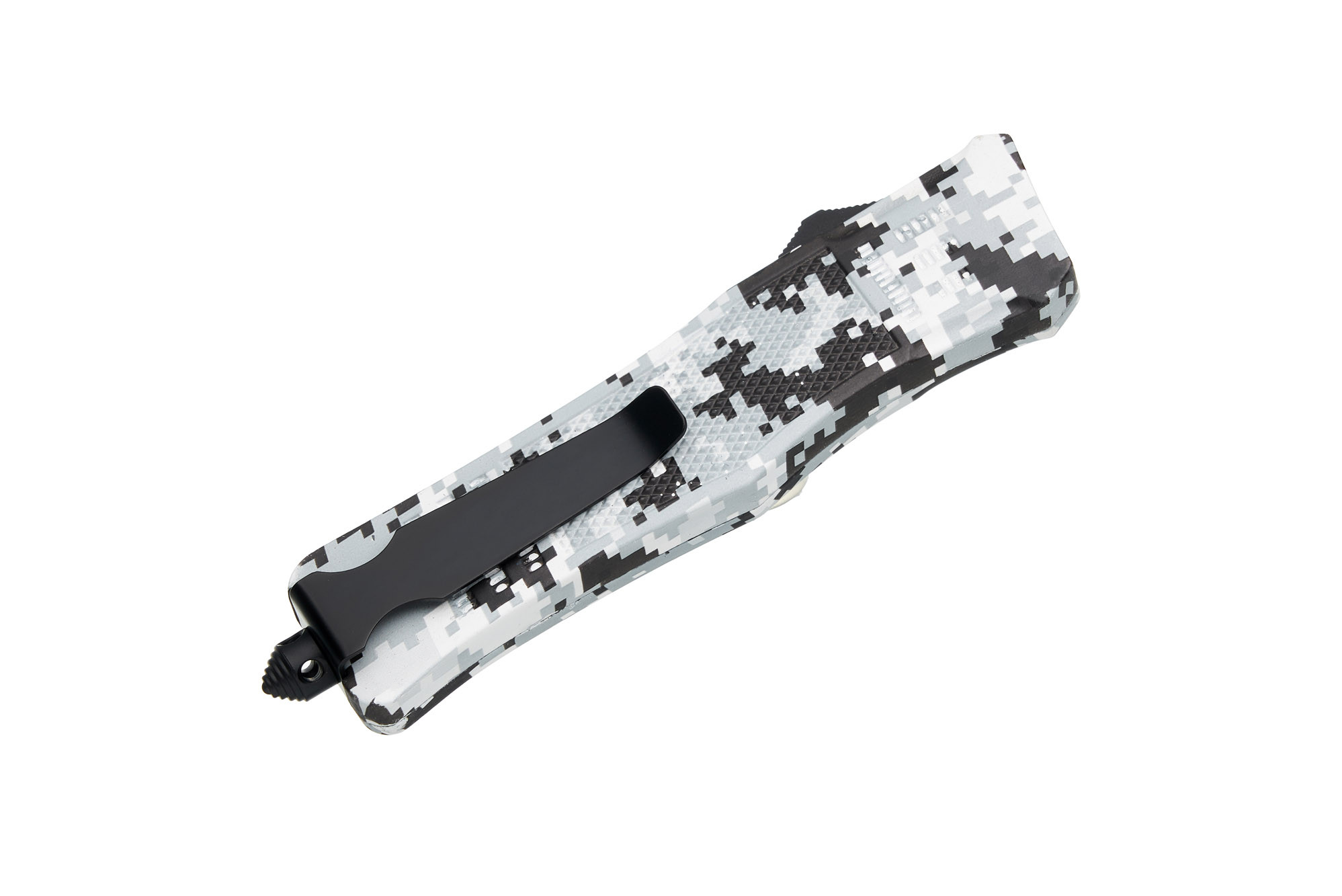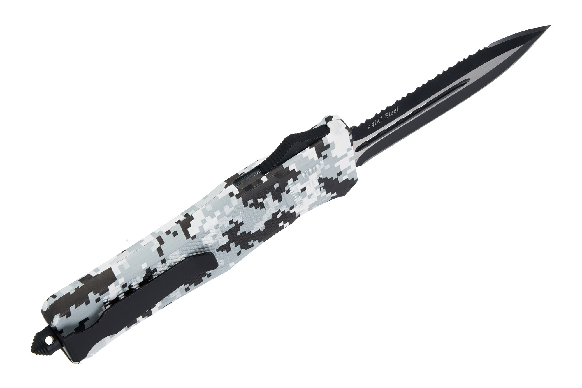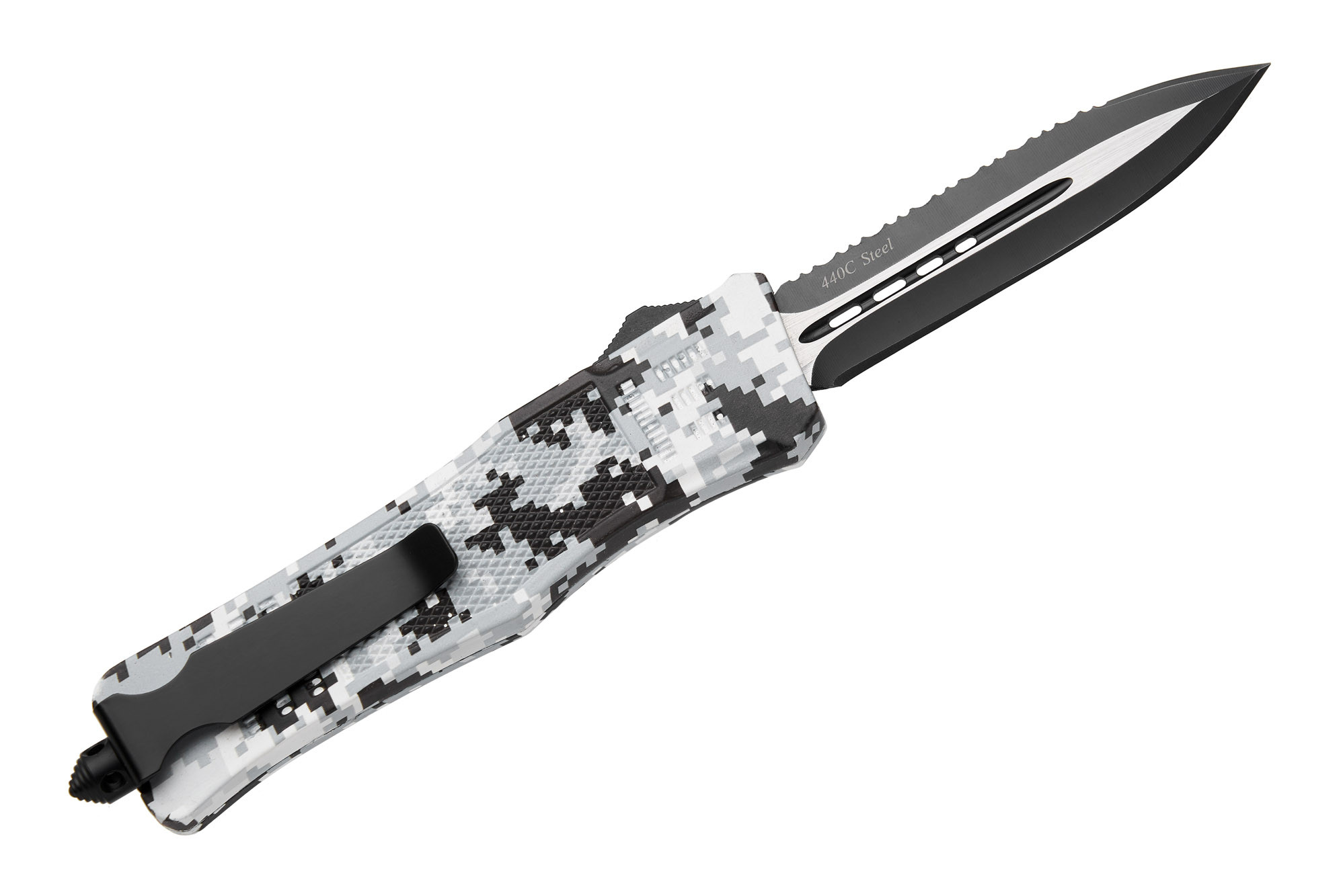 Клинок – обоюдоострый spearpoint с агрессивным технодизайном, типичным для современных фронталок. Одно из лезвий ножа – серрейторное (такие режущие кромки лучше режут различные верёвки, шнуры и ремни). Длина клинка – 90 мм, толщина 2,8 мм. Материал – нержавеющая сталь 440С, известная своей прочностью и отличной сопротивляемостью коррозии.