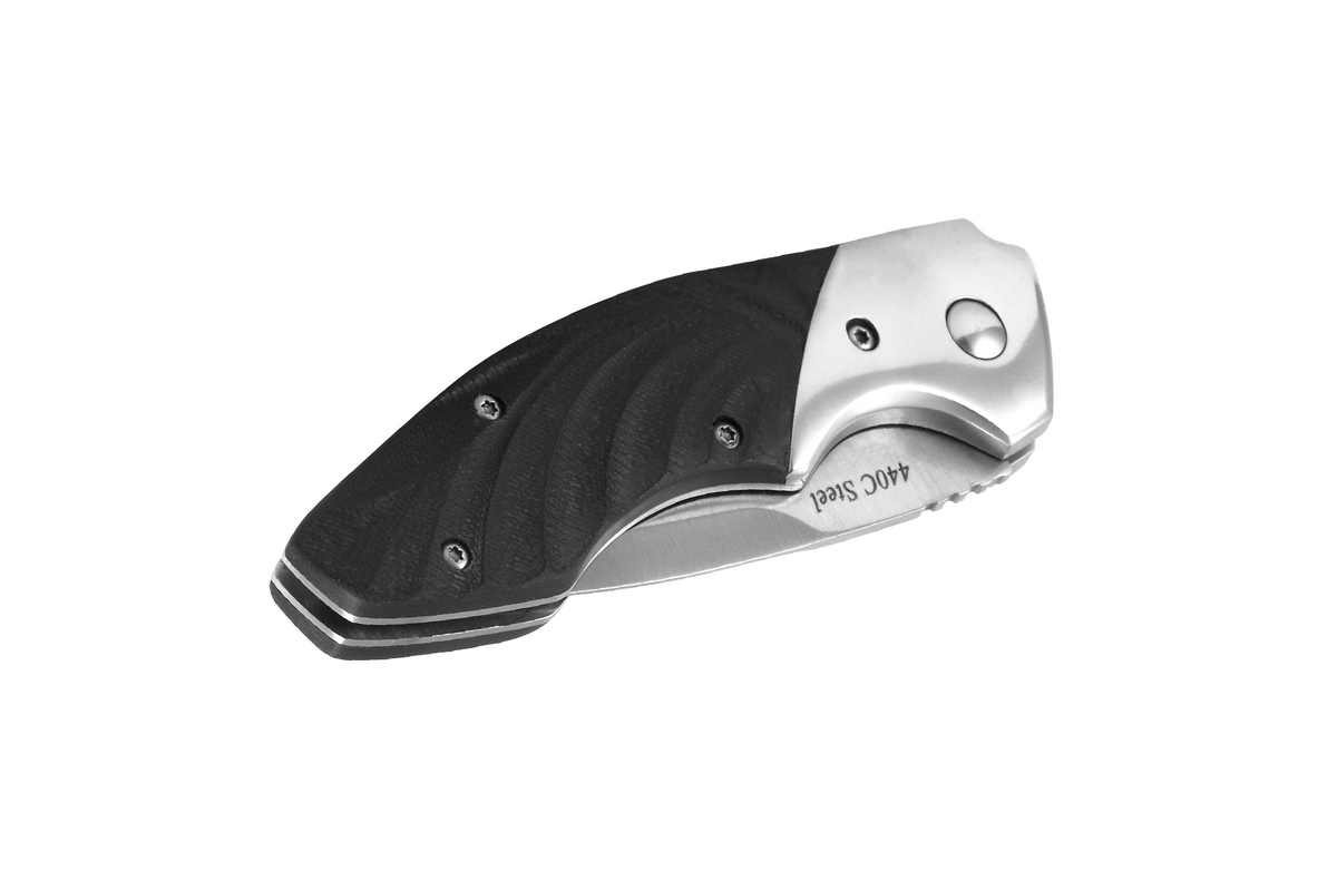 Замок традиционный для такого типа ножей это Plunge lock или так называемый кнопочный замок. Схема работы такого замка весьма проста – подпружиненный штифт в закрытом и открытом положении ножа входит в специальные пазы на клинке, тем самым фиксируя его в конечных положениях. Для предотвращения случайного раскрытия предусмотрен очень удобный предохранитель, расположенный на «спине» ножа.