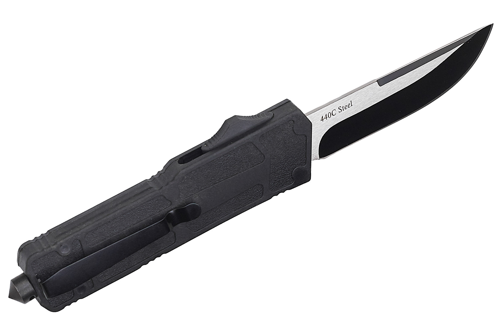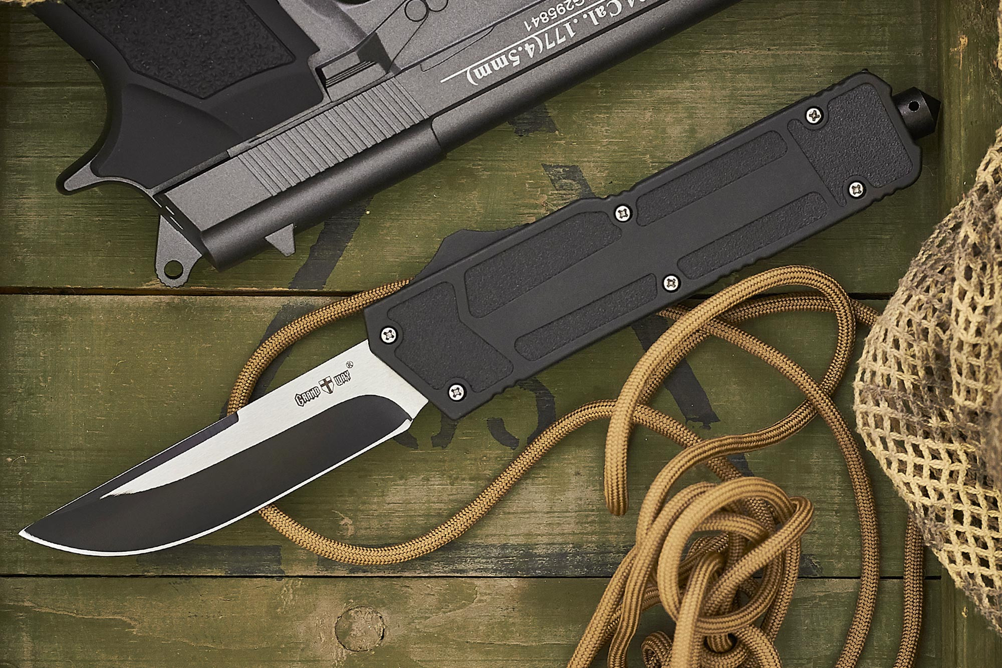 Выкидной нож Grand Way 9182 BC оснащён механизмом двухоперационного типа (Out The Front Double Auto). Иными словами, смещённый вперёд слайдер вызыват выброс клинка вперёд, смещённый назад – убирает клинок обратно в рукоять.