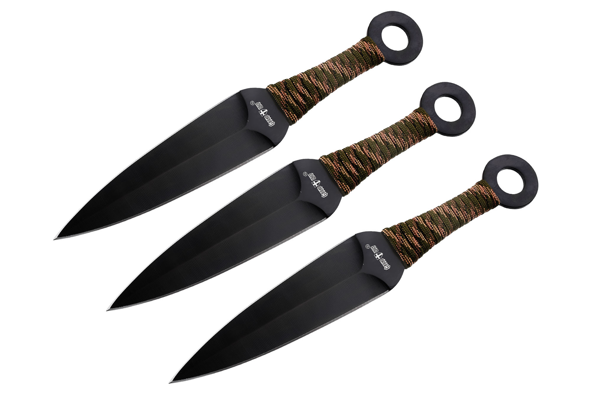 Не заточенная часть ножа, обернутая паракордом, – это рукоять. Ее окончание сделано в виде кольца, с помощью которых всю троицу можно скрепить вместе. А также подвешивать на крепление, привязывать к ножу, если нужно, темляки или полоски ткани для стабилизации, красоты или легкости обнаружения улетевших в траву ножей.