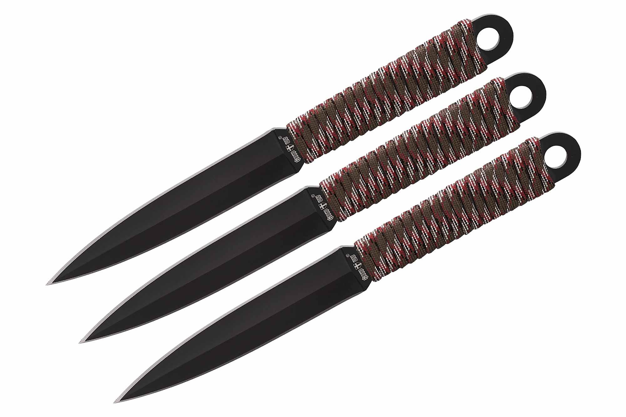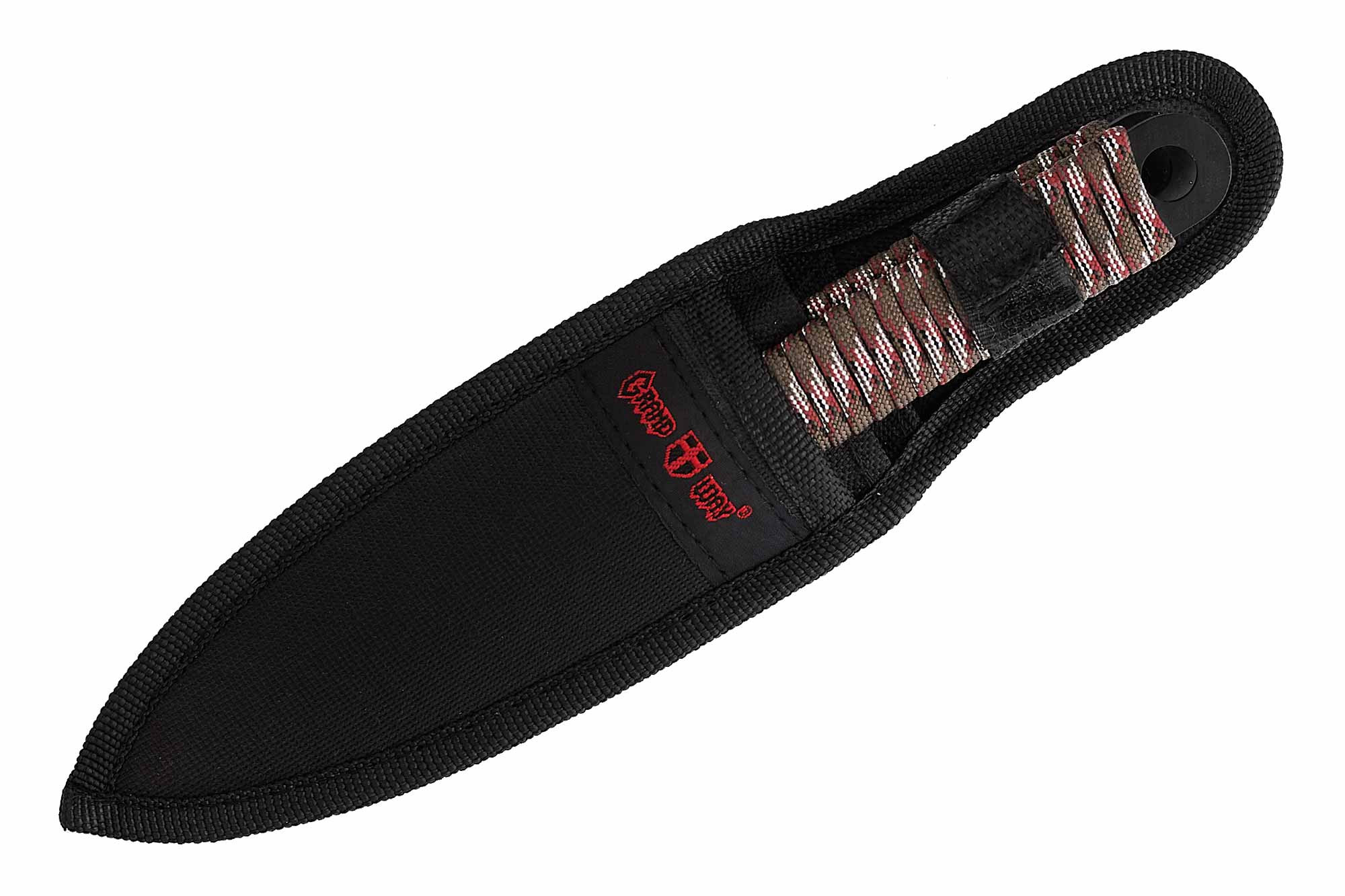 Шнур, намотанный на хвостовик клинка, заменяет накладки рукояти (которые могли бы расколоться при неудачном броске). Расцветка шнура отлично сочетается с чёрным покрытием ножа, что, кроме прочего, делает набор ещё и красивым, оригинальным подарком.
