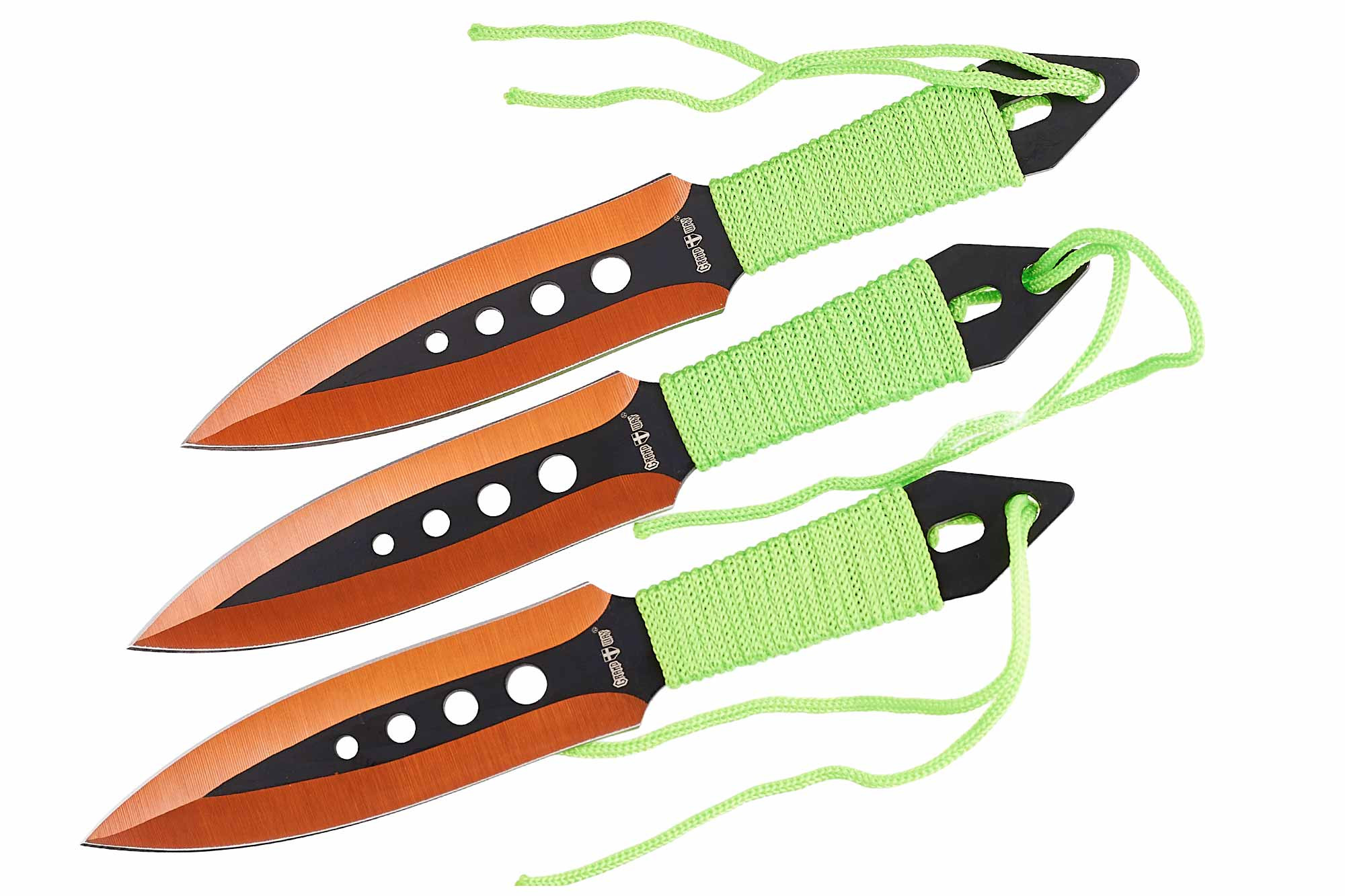 YF-16 (3 в 1) – комплект из трёх метательных ножей, чей дизайн можно назвать молодёжным и даже жизнерадостным. Сразу видно, что набор предназначен для качественного проведения досуга на свежем воздухе. Именно с этой целью и стоит купить метательный нож в наше время.