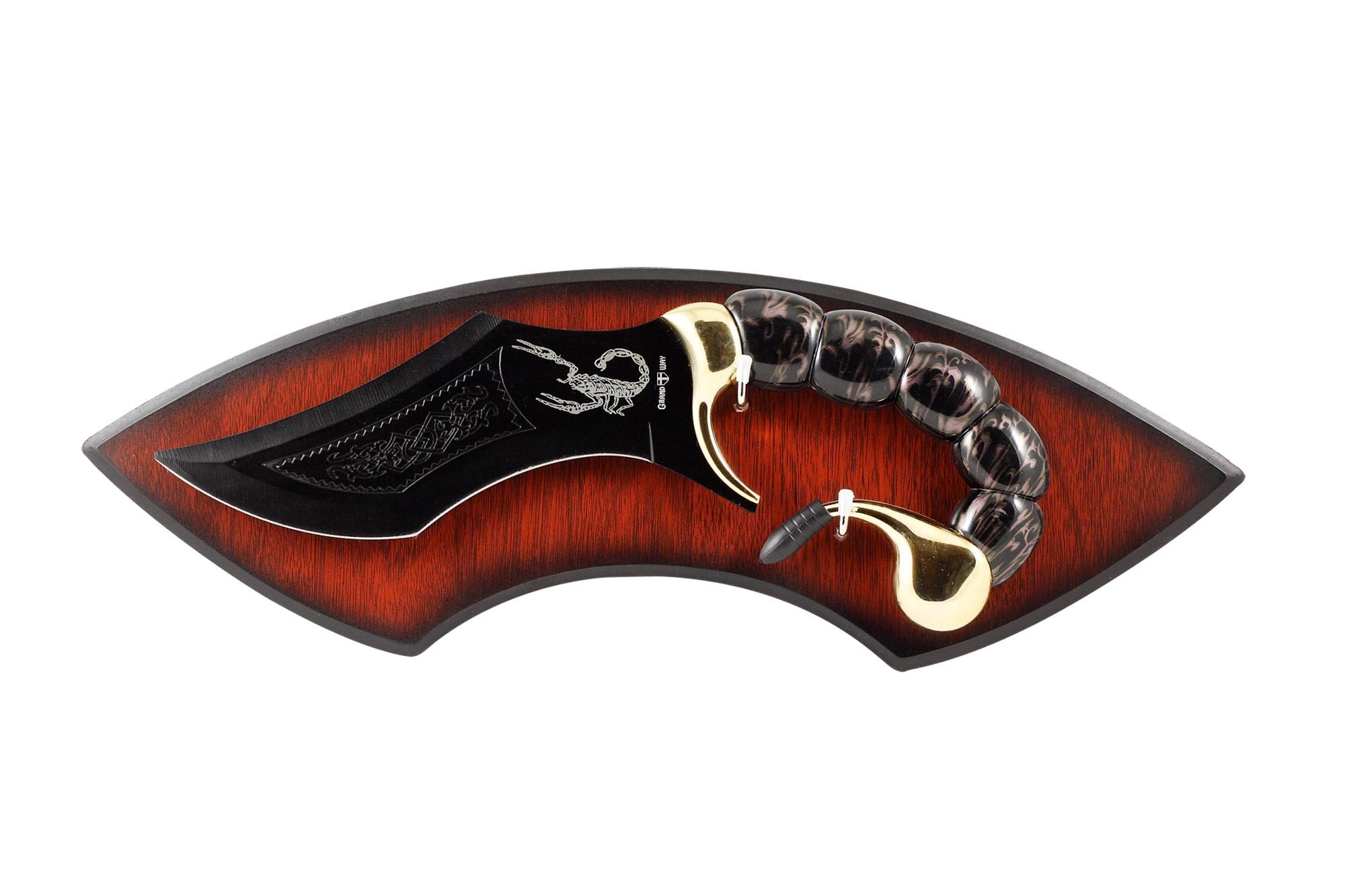 Незабутньо виглядає цей скорпіон і при експонуванні. Щит-панно, що входить до комплекту, підтримує і підкреслює обриси ножа своїми формами. Разом вони складають закінчений ансамбль, здатний прикрасити як полицю або стіну кабінету, так і інтер'єр бару або кафе.
