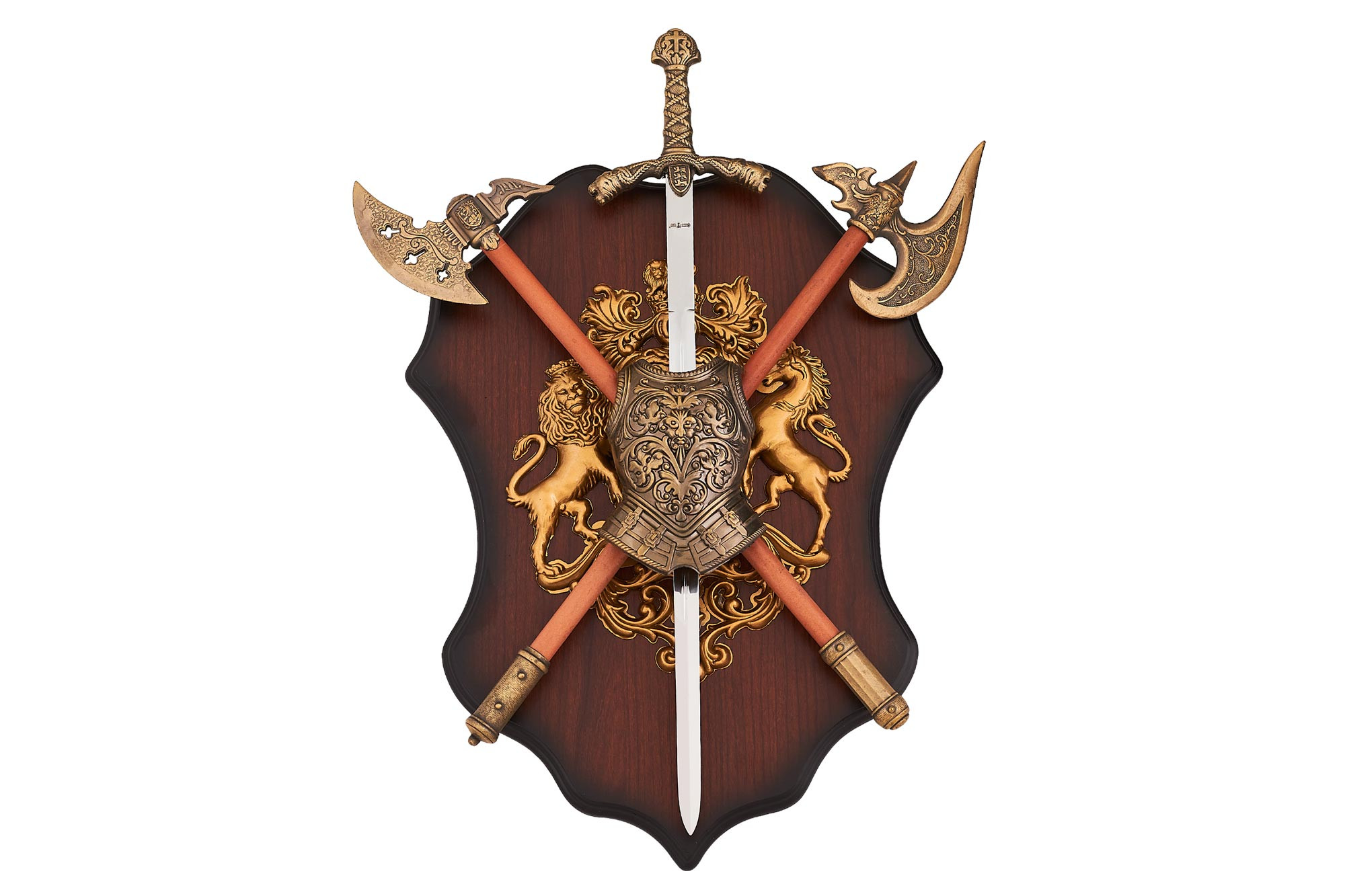 Панно состоит из деревянного щита с геральдическим узором, поверх которого закреплены качественные изображения рыцарской кирасы, скрещенных боевых секир и рыцарского меча, украшенного изображениями львов и гербом Ричарда Львиное сердце. Все элементы рыцарской экипировки детализированы и выполнены со вкусом. Клинок меча изготовлен из полированной нержавеющей стали марки 420. При этом лезвия моделей не заточены и совершенно безопасны!