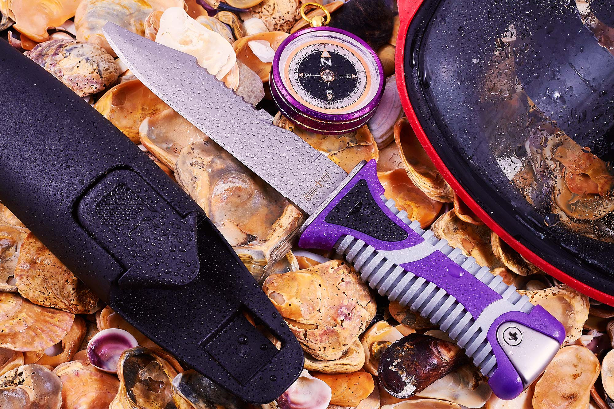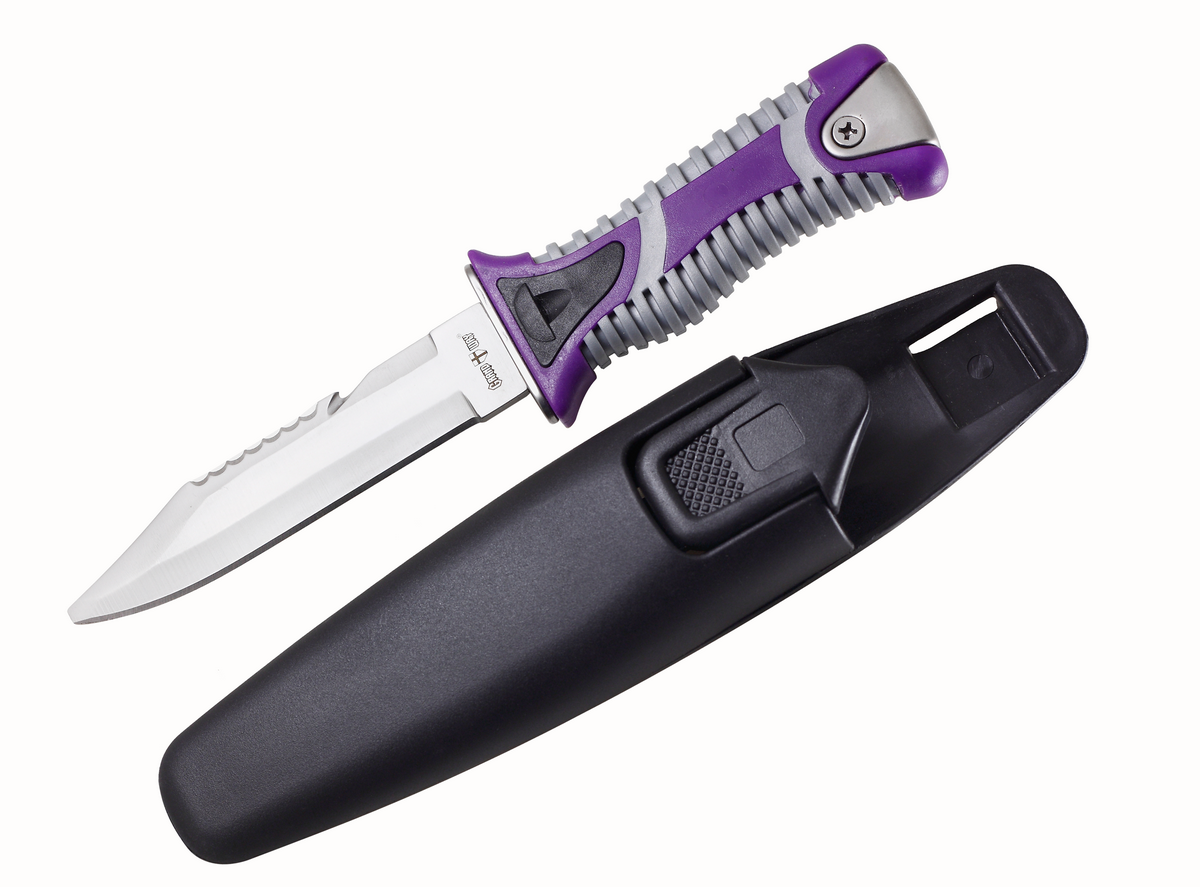 Нож удобен для работы как голой рукой так и в перчатках. Яркий сиреневый окрас рукояти заметен под водой и в условиях недостаточного освещения. Прочный, с мощным клинком для подводных работ.