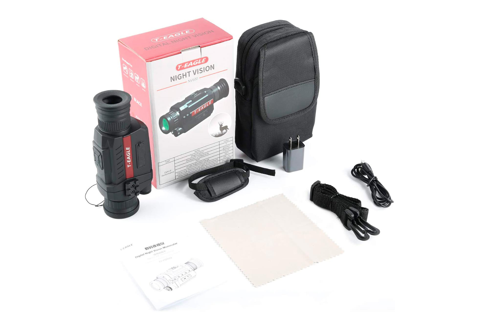 С приобором ночного видения T-Eagle NV600 поставляются: прочная сумка-чехол из синтетической ткани плотного плетения, зарядное устройство, USB-кабель, TV-кабель, карта памяти (находится в соотвествующем разъёме прибора).